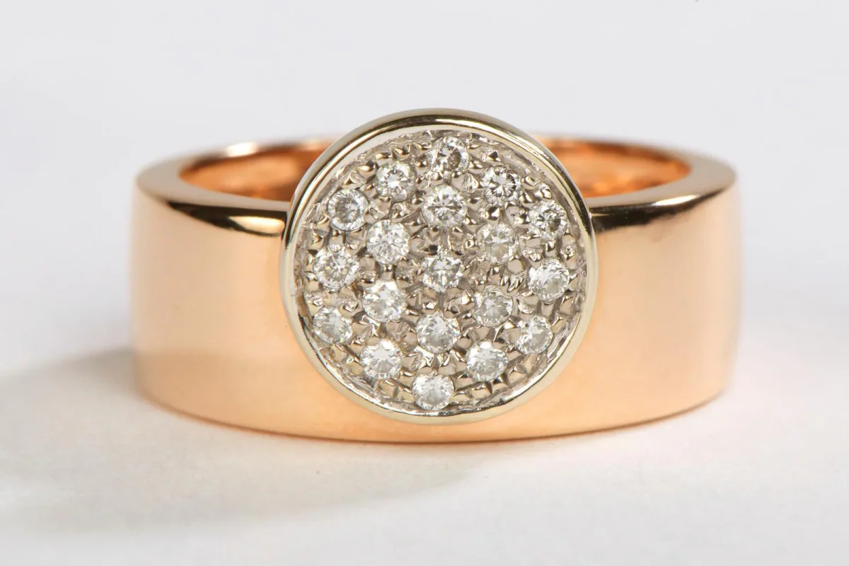 Ravissante bague en Or Rose 750 millièmes (18 carats), Sertie de 19 diamants taille brillant d’un poids total d’environ 0.095 ct, H-SI, Poids: 6.90 g, taille de doigt: 51, largeur de l’anneau: 0,7 cm, diamètre du cercle pavé: 1 cm, Poinçonné, excellent état,
