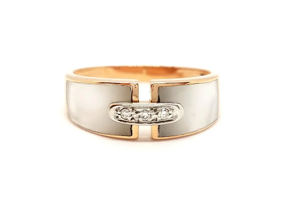 Bague en or rose 750 millièmes (18 carats) et nacre, pavée de 3 diamants 8/8 H-SI pour environ 0,02 ct au total, tour de doigt: 54, largeur sur le dessus: 0,67 cm, poids total: 3,57 g, poinçon tête d’aigle, excellent état