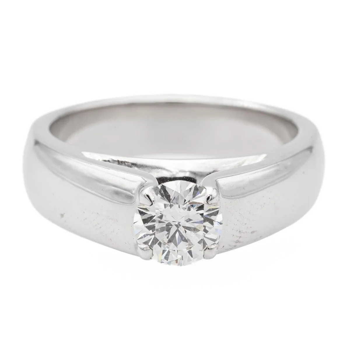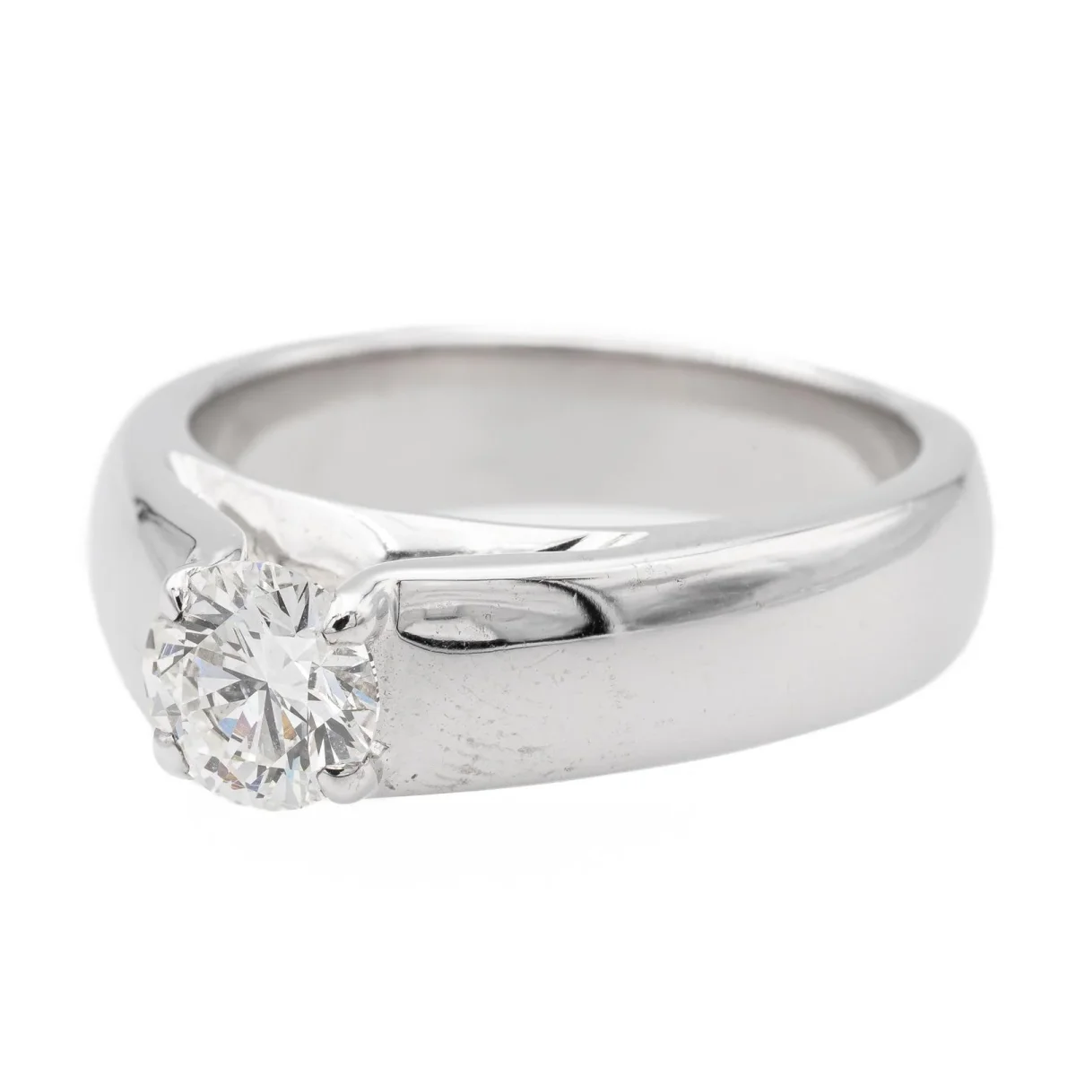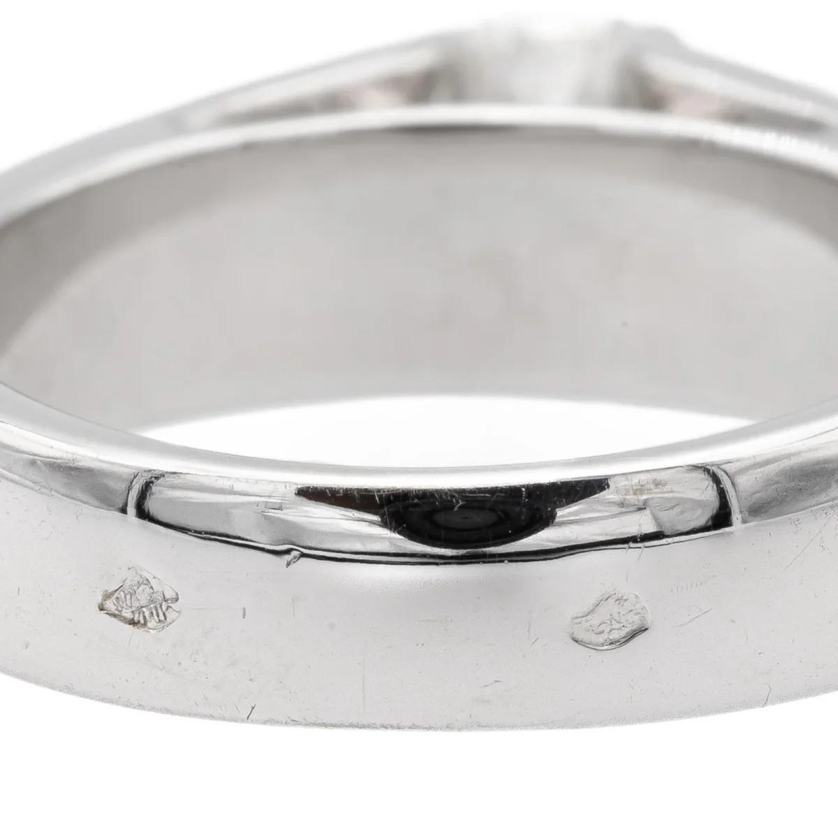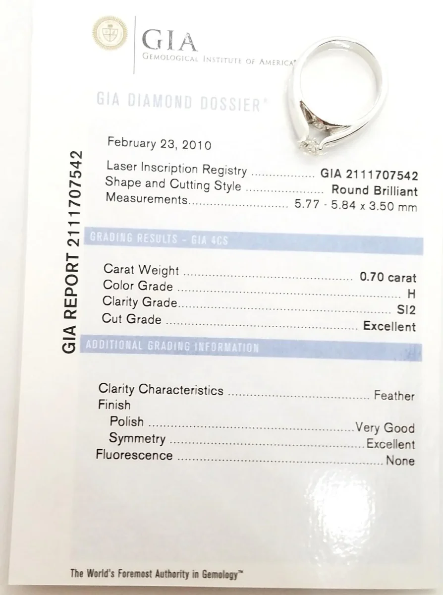 Solitaire en or blanc 750 millièmes (18 carats), serti d’un diamant taille brillant de 0,70 ct H-SI2 certifié GIA, tour de doigt: 54, largeur de l’anneau: 0,52 cm, poids total: 9,56 g, poinçon tête d’aigle, état neuf