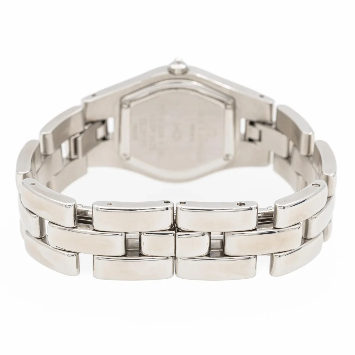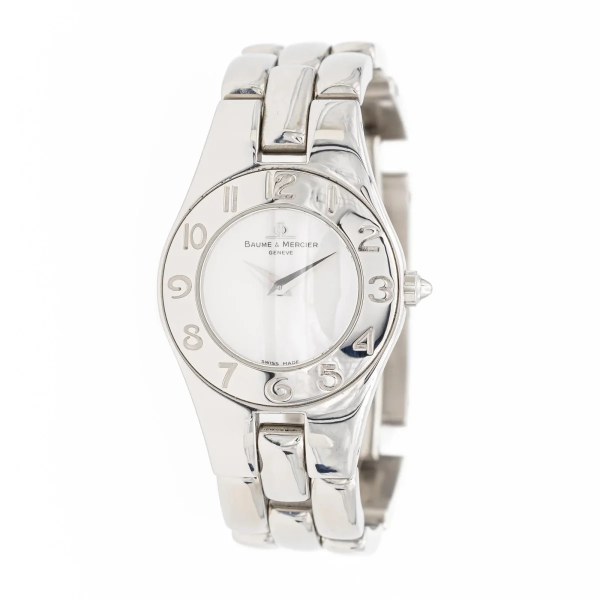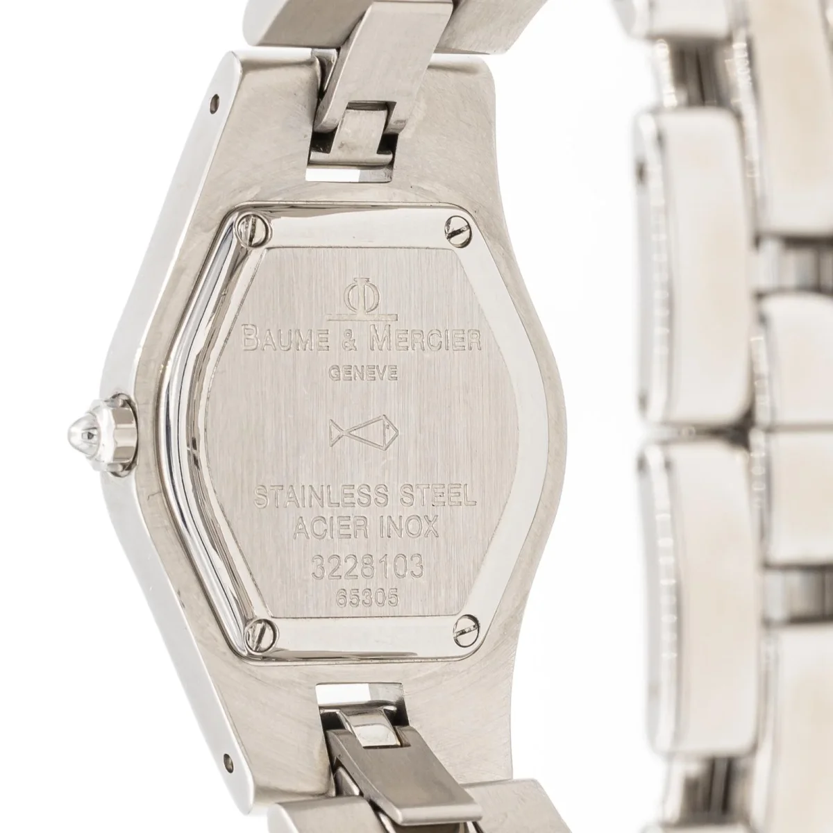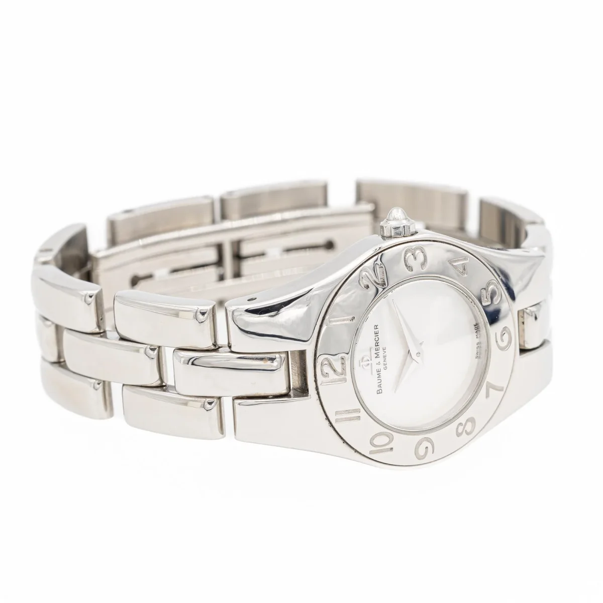 Montre Dame, signée de la maison Baume et Mercier, modèle Linea 65305, boîtier 24 mm, mouvement quartz, cadran blanc, boucle déployante, révisée, taille poignet: 17 cm, largeur bracelet: 1,4 cm, numérotée n° 3228103, poids total: 56,31 g, excellent état
