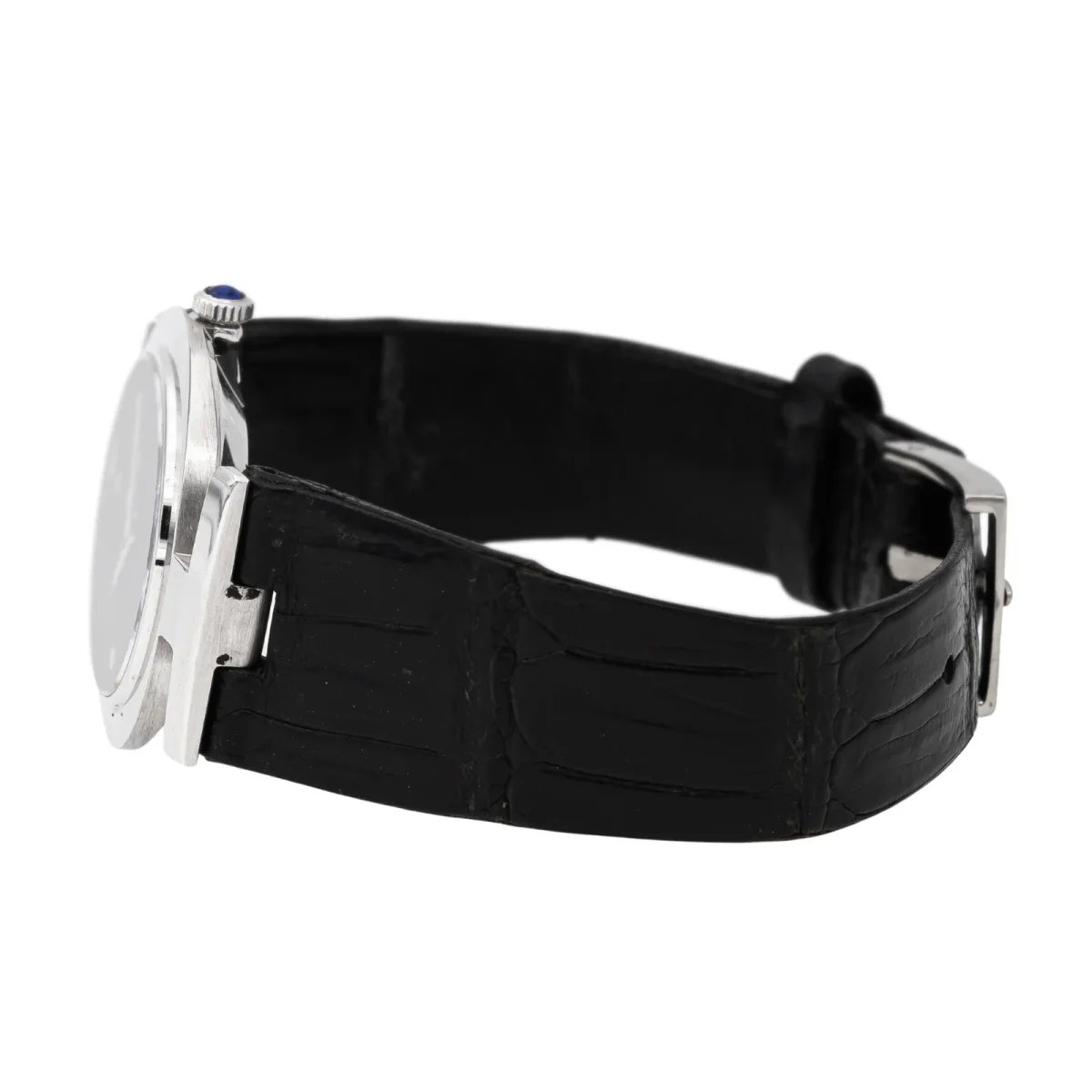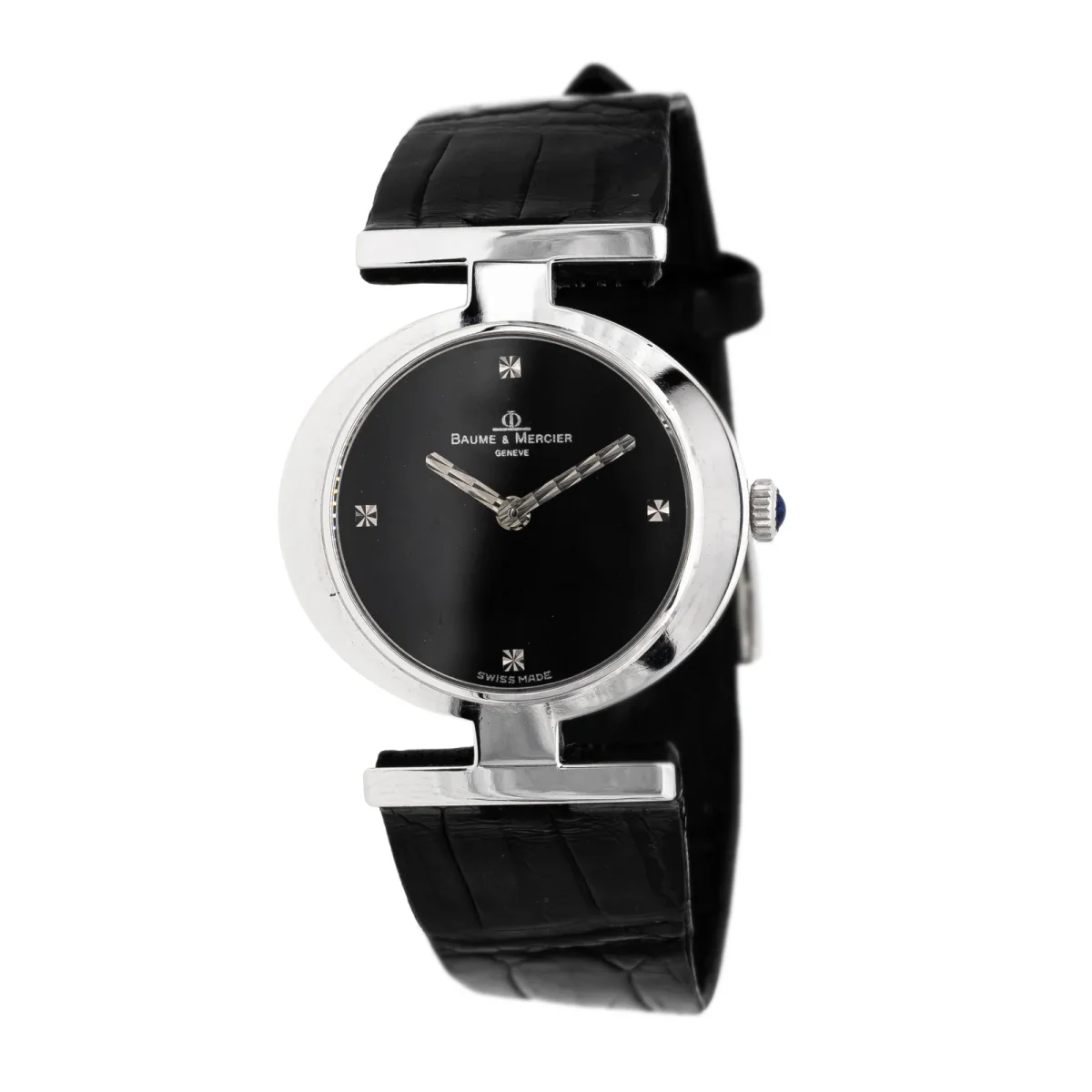 Montre Baume et Mercier,or blanc 750 millièmes (18 carats), mouvement mécanique remontage manuel, bracelet cuir noir d’origine, longueur bracelet : 20,50 cm, boucle ardillon, boitier 27mm, cadran noir, révisé récemment, N° 471146 36618 2, poids : 24,11 g excellent état