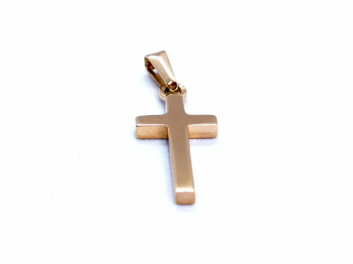 Pendentif croix signé de la maison Becker, en or jaune 750 millièmes (18 carats), dimensions (bélière incluse): 2,6 cm x 1 cm, poids total: 2,19 g, poinçon tête d’aigle, excellent état