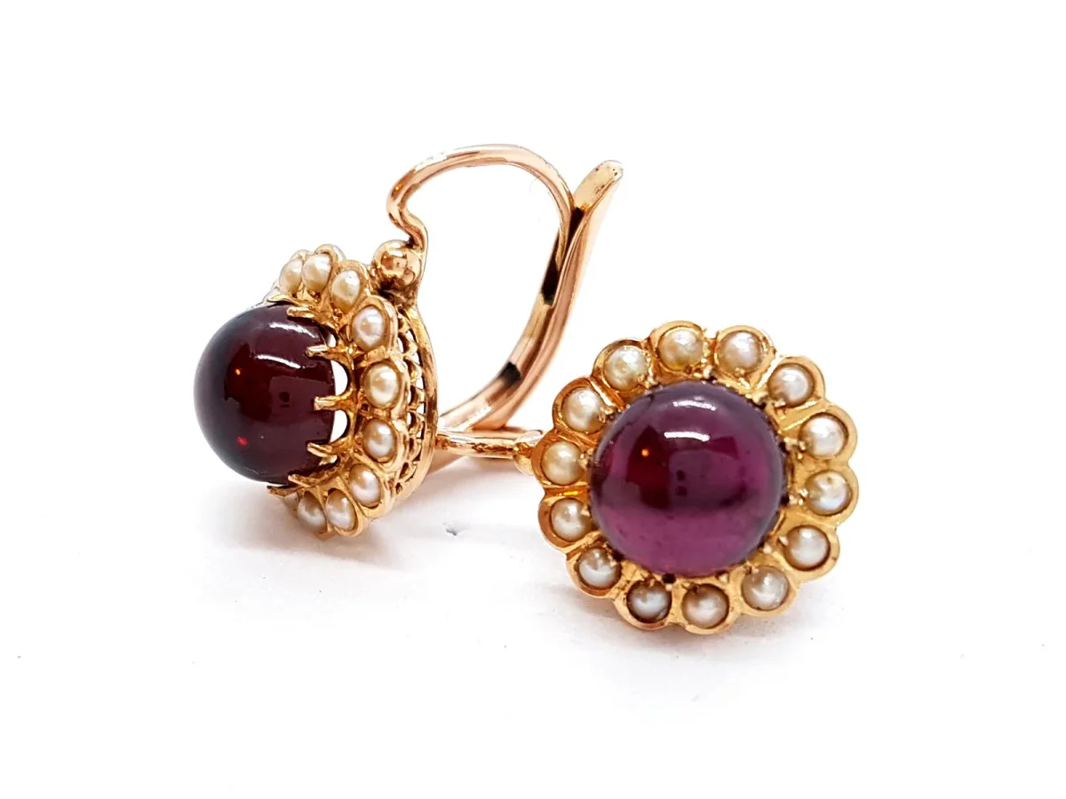Magnifiques boucles d’oreilles Art déco, en Or rose 750 millièmes (18 carats), serties de 2 grenats taillés en cabochon de 7 mm de diamètre, et de 28 perles fines de 1,2 mm de diamètre, dimensions: 1,75 cm x 1,2 cm, excellent état, poids total: 3,97 g
