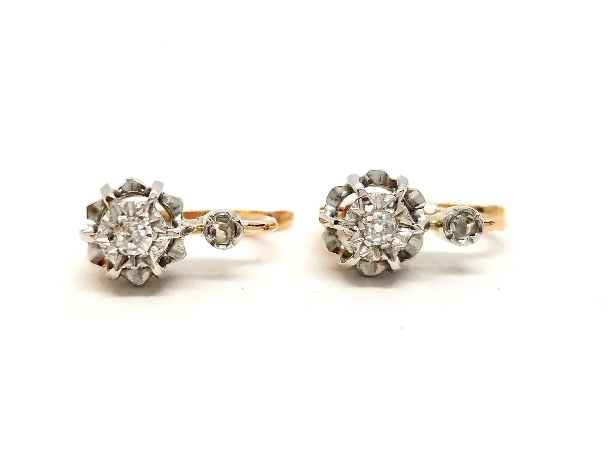 Boucles d’oreilles art déco en or rose 750 millièmes (18 carats) testé, Dormeuses, motif serti sur or blanc de 4 diamants taille ancienne H-SI pour environ 0,10 ct au total, dimensions: 1,37 cm x 0,74 cm,poids total: 3,76 g, excellent état