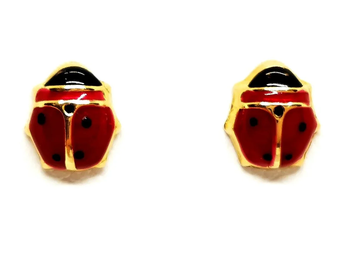 Boucles d’oreilles, en or jaune 750 millièmes (18 carats) testé, motifs coccinelles, en or jaune et laque, dimensions: 0,69 cm x 0,61 cm, poids total: 0,68 g, fermoir papillon, état neuf