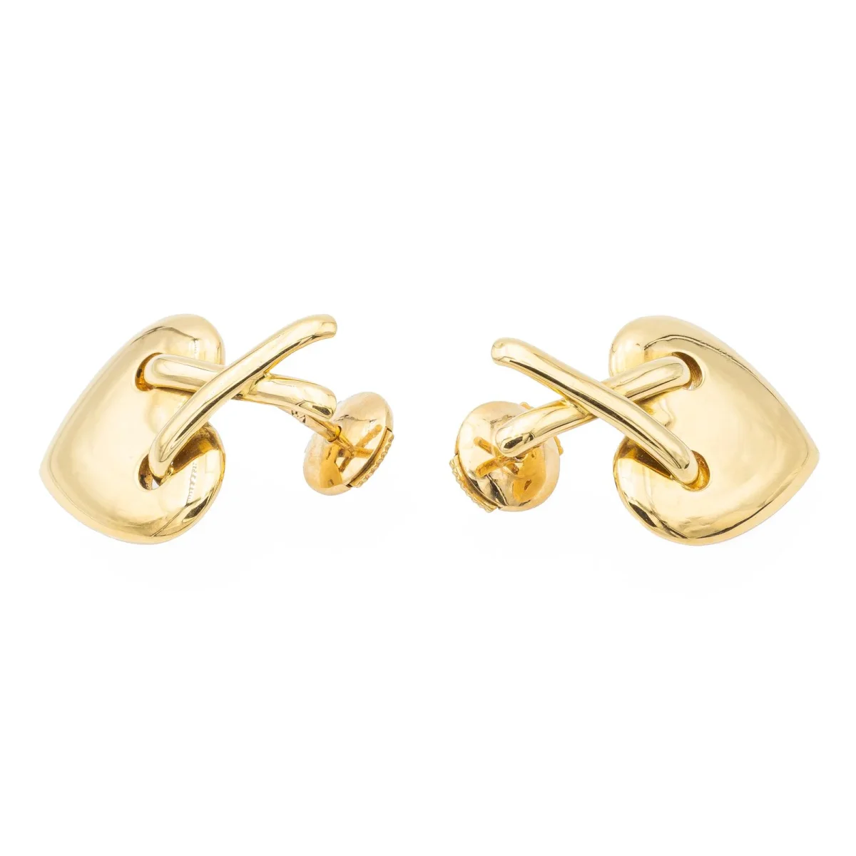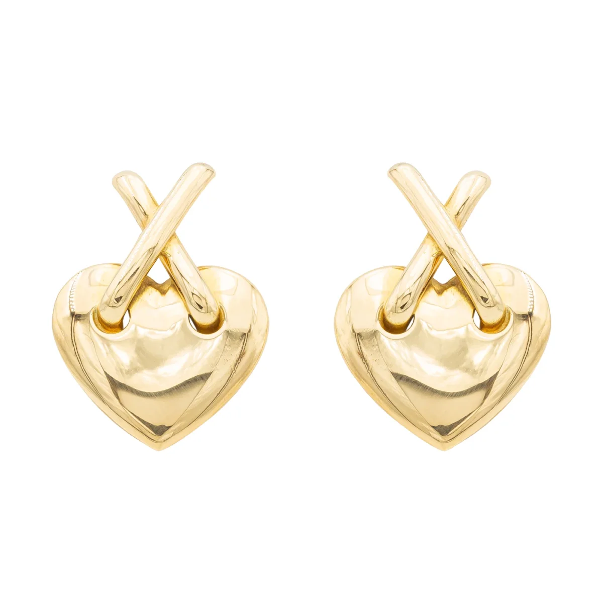 Boucles d’oreilles, en or jaune 750 millièmes (18 carats), figurant sur chaque boucle un coeur lisse en or jaune, surmonté d’un lien croisé en or jaune, dimensions: 2,19 cm X 1,58 cm, poids total: 8,57 g, fermoir alpa, poinçonné tête d’aigle, excellent état.