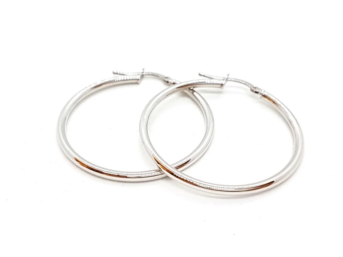 Créoles en or blanc 750 millièmes (18 carats), fil rond, diamètre: 3,4 cm, largeur: 0,2 cm, poids total: 1,68 g, état neuf