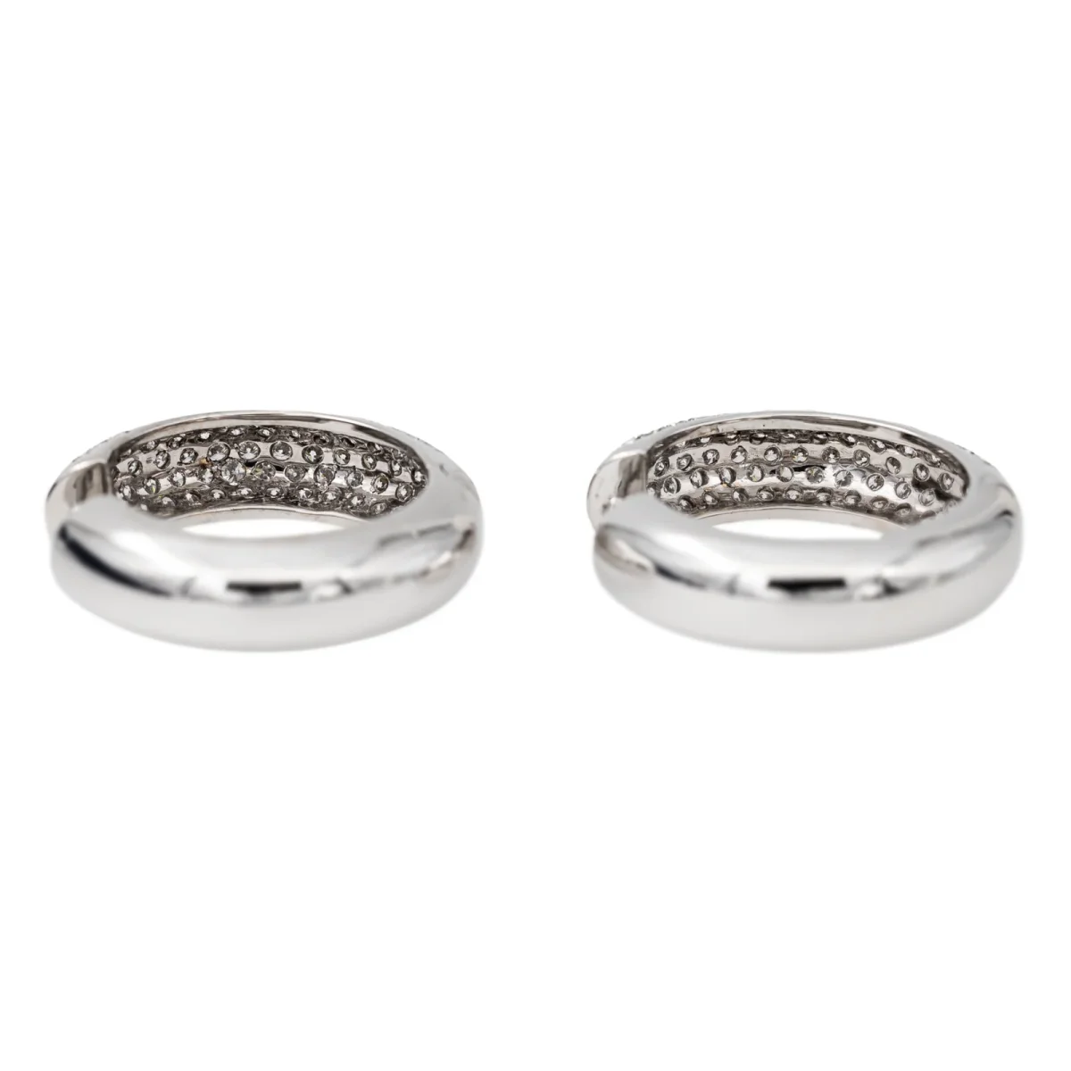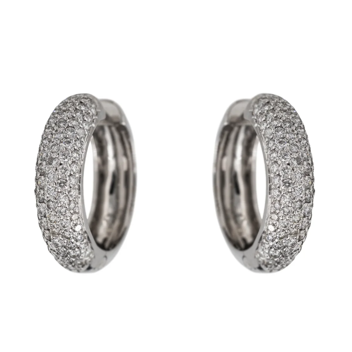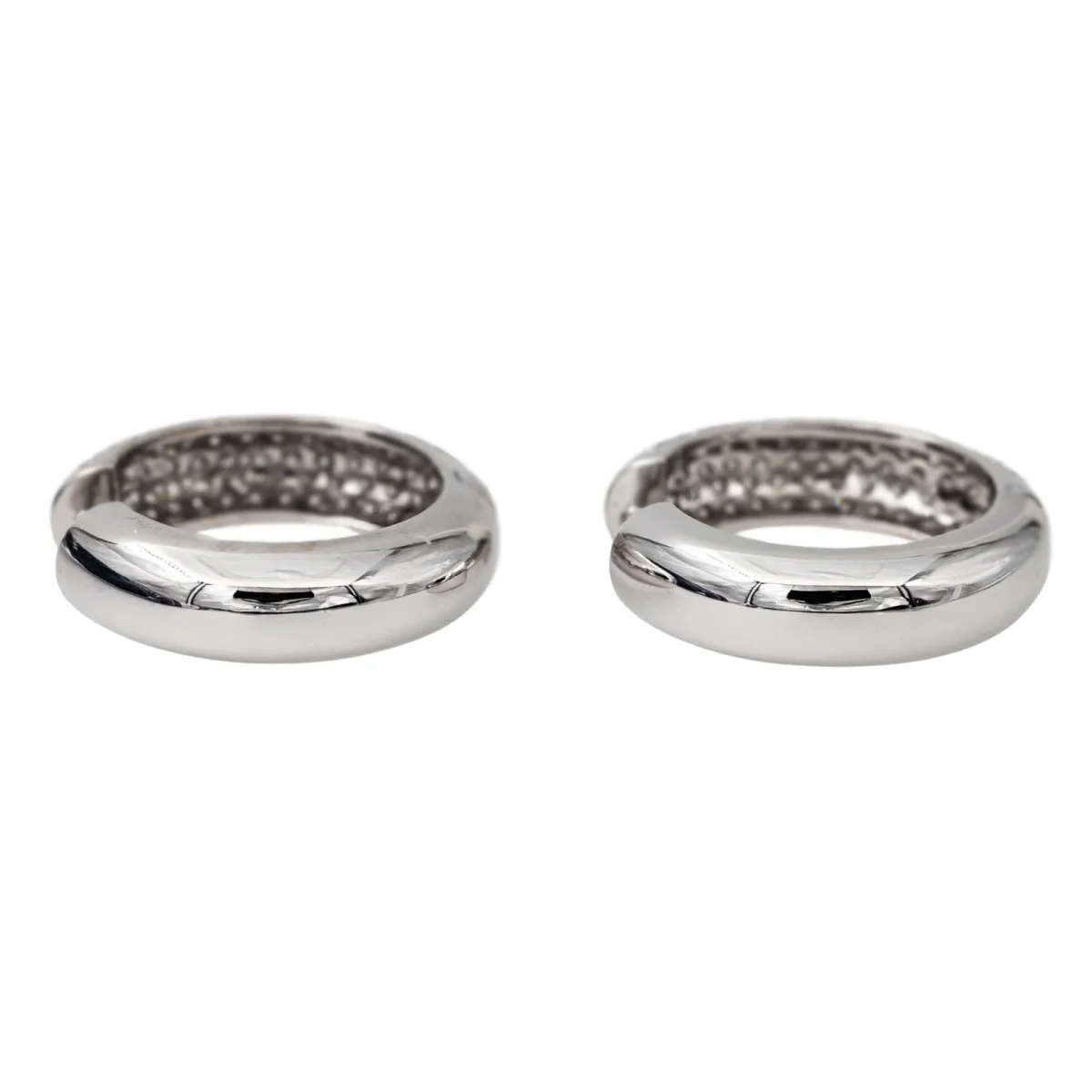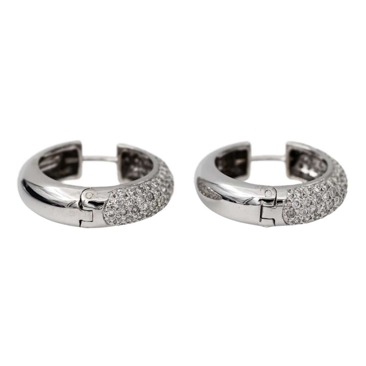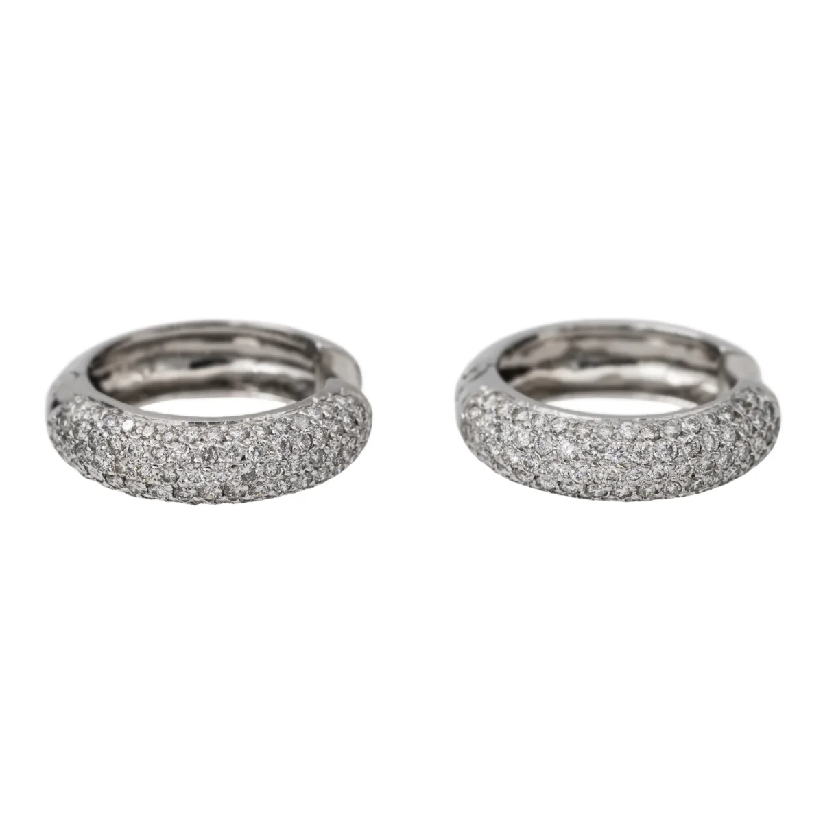 Créoles en or blanc 750 millièmes (18 carats), serties de 158 diamants taille brillant, estimés H/SI, chacun d’un poids d’environ 0,02 ct, poids total des diamants: 3,16 cts, longueur: 2,58 cm, largeur: 0,72 cm, poids total: 15,55 g, poinçon hibou, excellent état