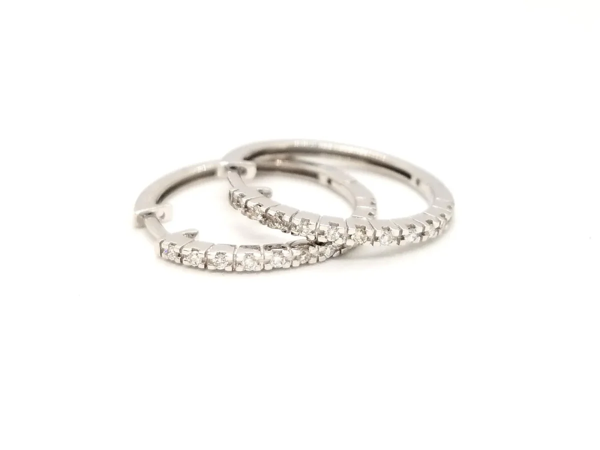 Créoles en or blanc 750 millièmes (18 carats) testé, serties de 22 diamants taille brillant G-H SI pour 0,16 ct au total, diamètre 2,19 cm x 2,09 cm, largeur: 0,15 cm, poids total: 3,79 g, excellent état