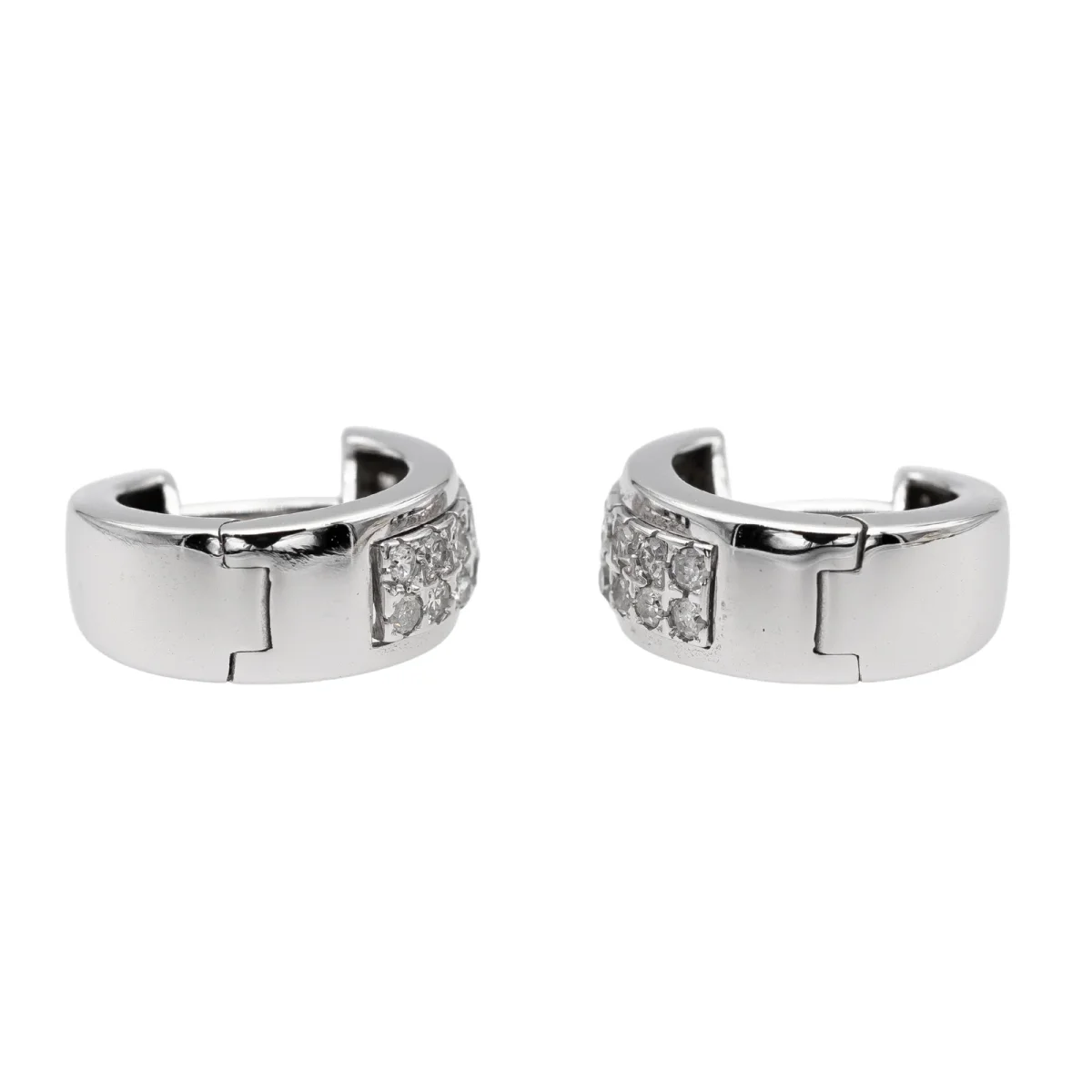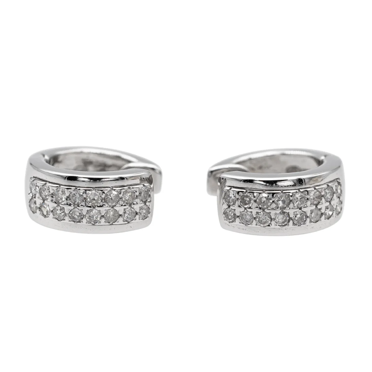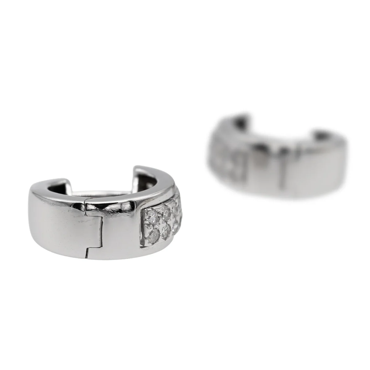 Créoles en or blanc 750 millièmes (18 carats) testé, serties de diamants taille huit/huit, 32 diamants envrion H-P, d’environ 0,005 ct chacun, poids total diamants: envrion 0,16 ct, diamètre: 1,18 cm, largeur: 0,48 cm, poids total: 3,05 g, excellent état