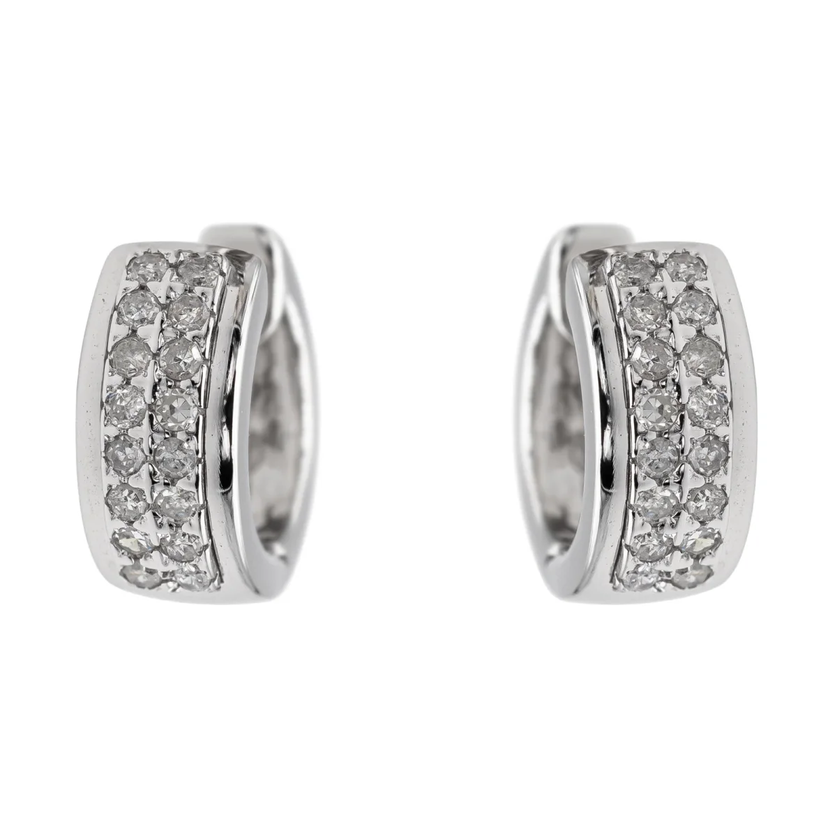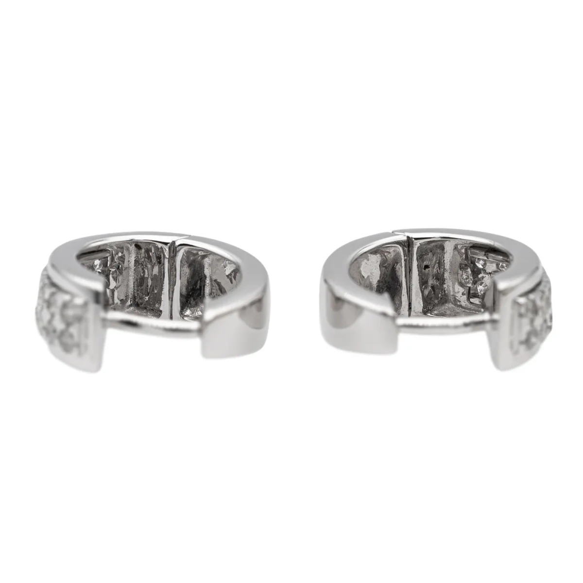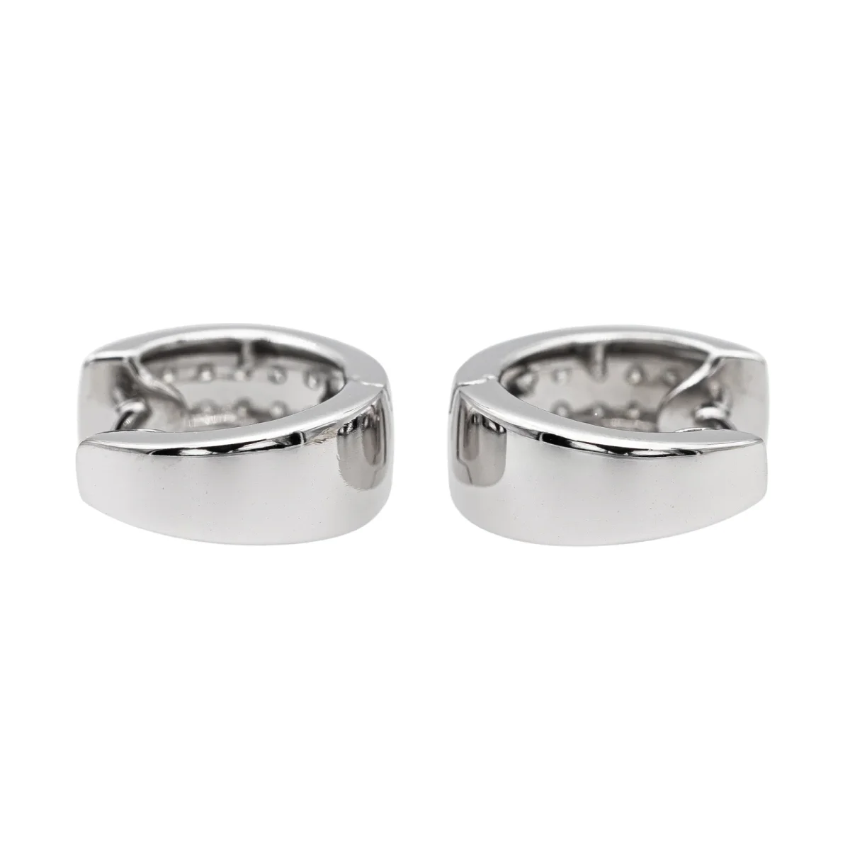 Créoles en or blanc 750 millièmes (18 carats) testé, serties de diamants taille huit/huit, 32 diamants envrion H-P, d’environ 0,005 ct chacun, poids total diamants: envrion 0,16 ct, diamètre: 1,18 cm, largeur: 0,48 cm, poids total: 3,05 g, excellent état
