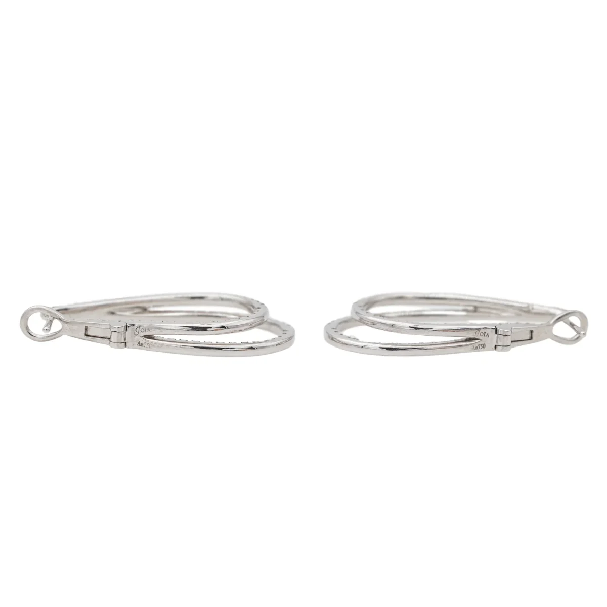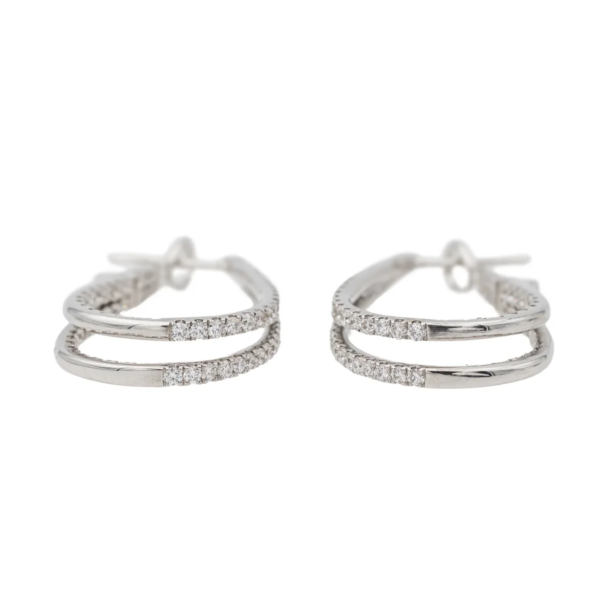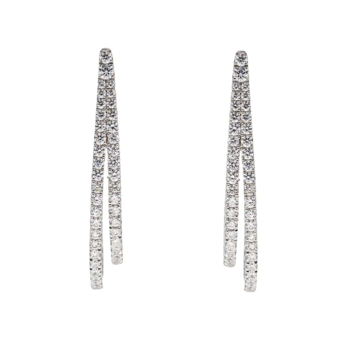 Créoles en or blanc 750 millièmes (18 carats), serties de 168 diamants taille brillant, environ G-VS, d’un poids total d’environ 1,84 cts, (4 diamants d’environ 0,03 ct, 4 diamants d’environ 0,024 ct, 4 diamants d’environ 0,015 ct et 156 diamants d’environ 0,01 ct), longueur : 3,24 cm, largeur : 0,44 cm, poids total : 7,17 g, poinçon tête d’aigle, excellent état