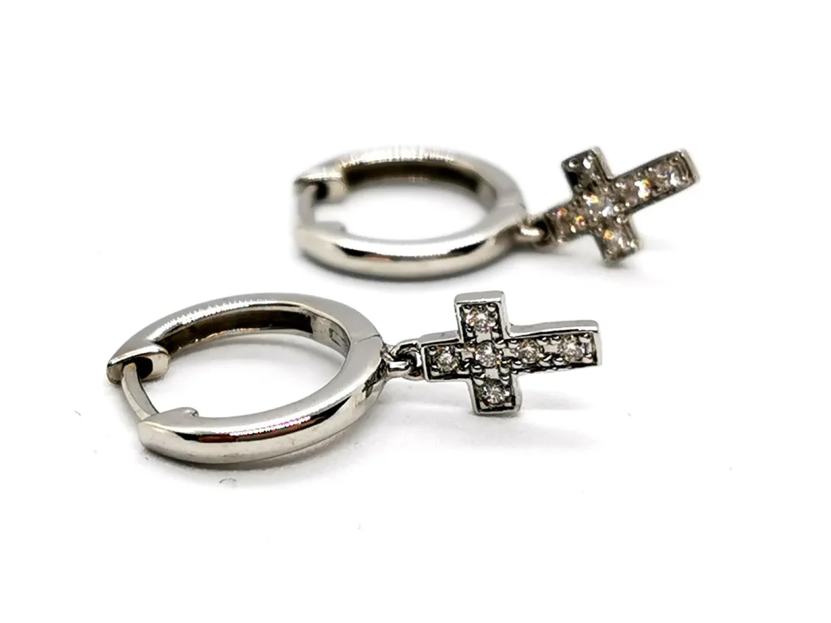 Boucles d’oreilles, en or blanc 750 millièmes (18 carats) testé, petites créoles, pendentif croix en diamants, sertis de 12 diamants, taille brillant, environ G/VS, pour un total d’environ 0,08 ct, diamètre anneau: 1,2 cm, dimensions croix: 0,91 x 0,55 cm, longueur totale: 2,14 cm, poids total: 2,23 g, excellent état.