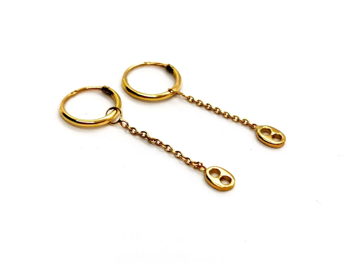 Boucles d’oreilles, en or jaune 750 millièmes (18 carats) testé, petites créoles avec chaînette et pampille, diamètre créoles: 1,04 cm, largeur créoles: 0,12 cm, longueur du pendant: 2,55 cm, poids total: 0,90 g, excellent état