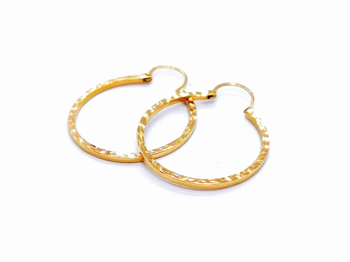 Créoles en or jaune 750 millièmes (18 carats), fil carré, martelé sur la tranche, diamètre: 2,68 cm, largeur: 0,13 cm, poids total: 4,56 g, poinçon tête d’aigle, excellent état