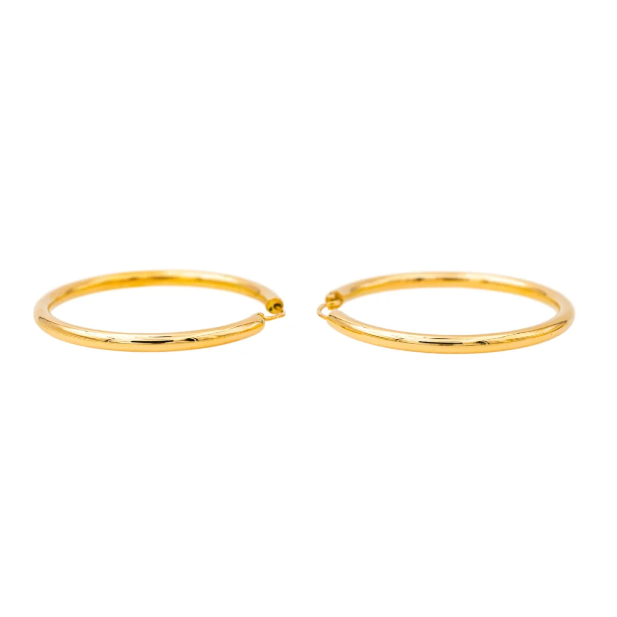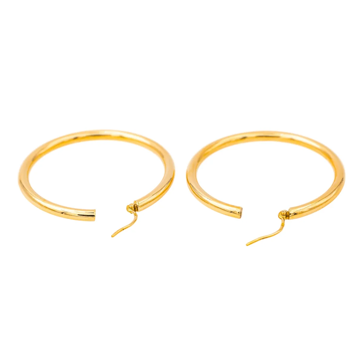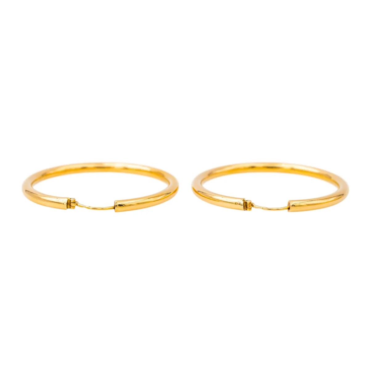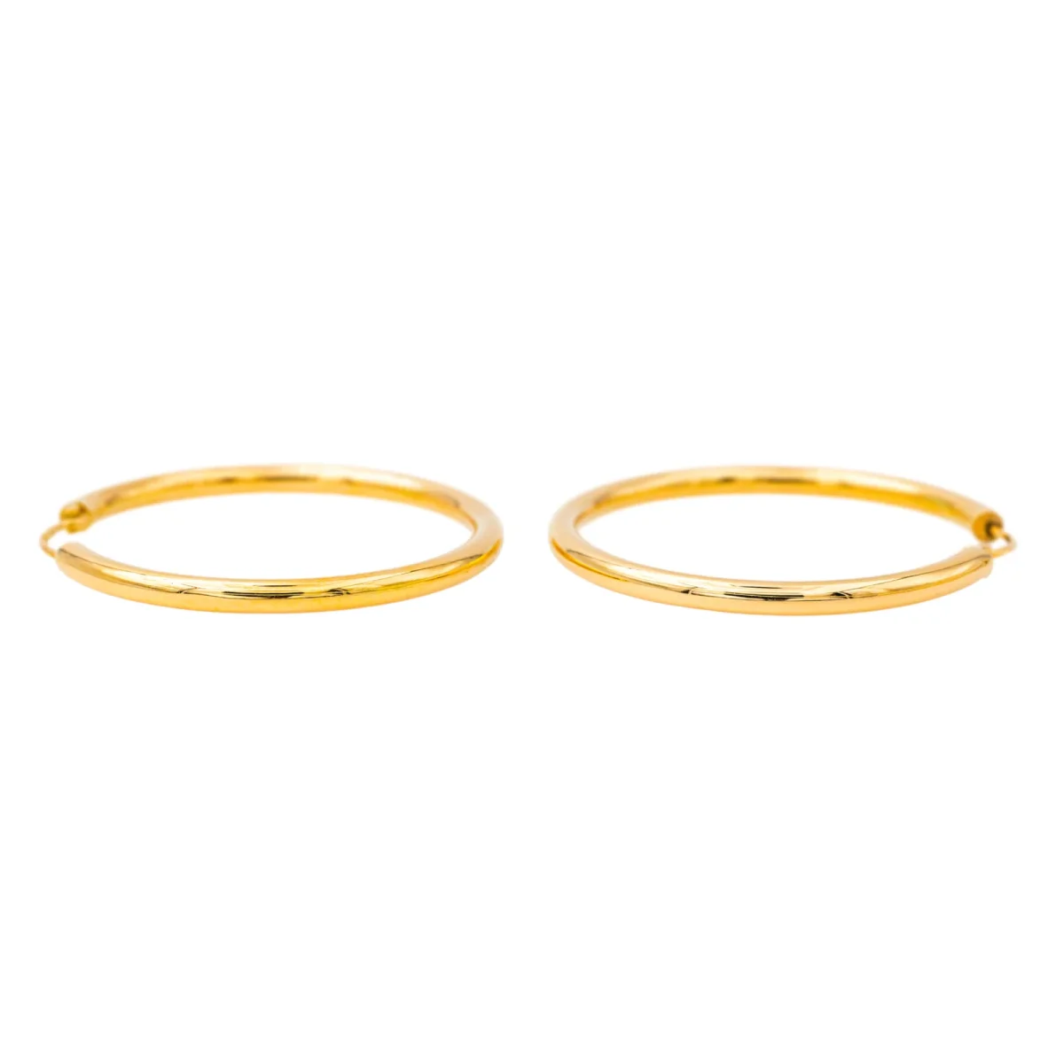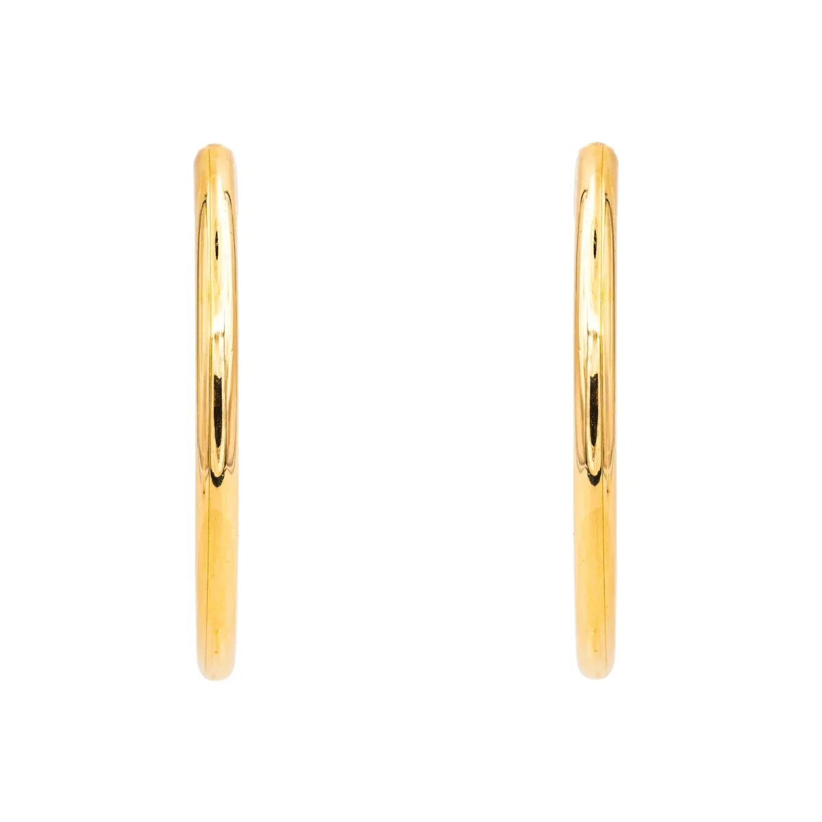 Créoles en or jaune 750 millièmes (18 carats), fil rond, diamètre : 3,44 cm, largeur : 0,30 cm, poids total : 4,13 g, poinçon tête d’aigle, excellent état