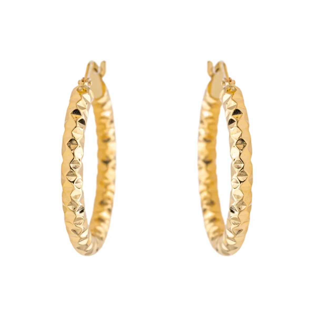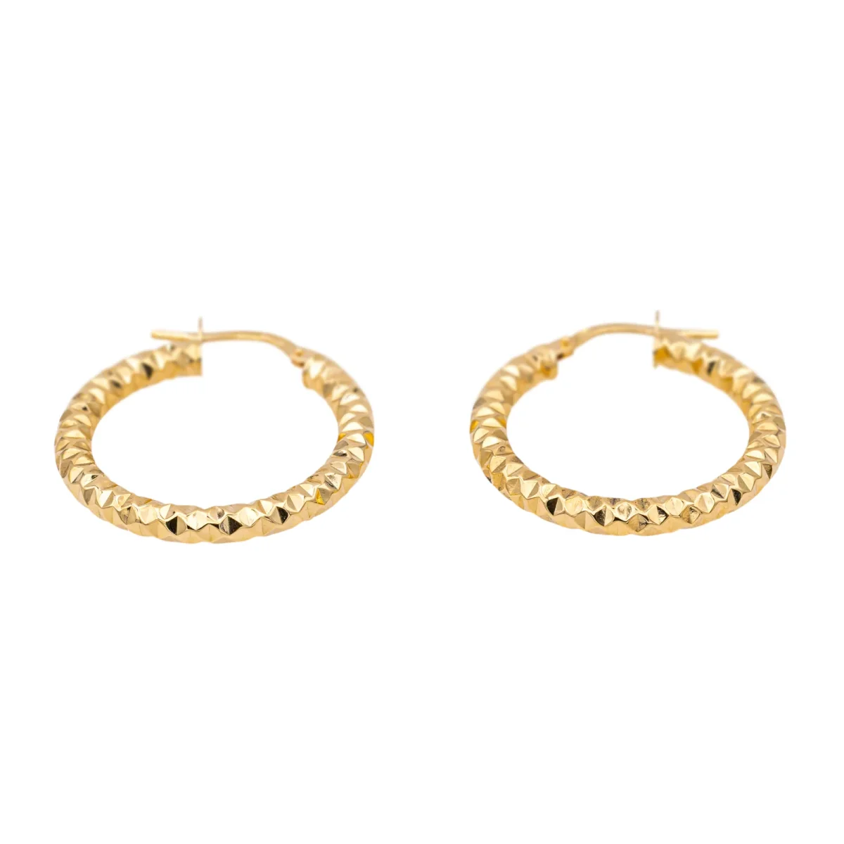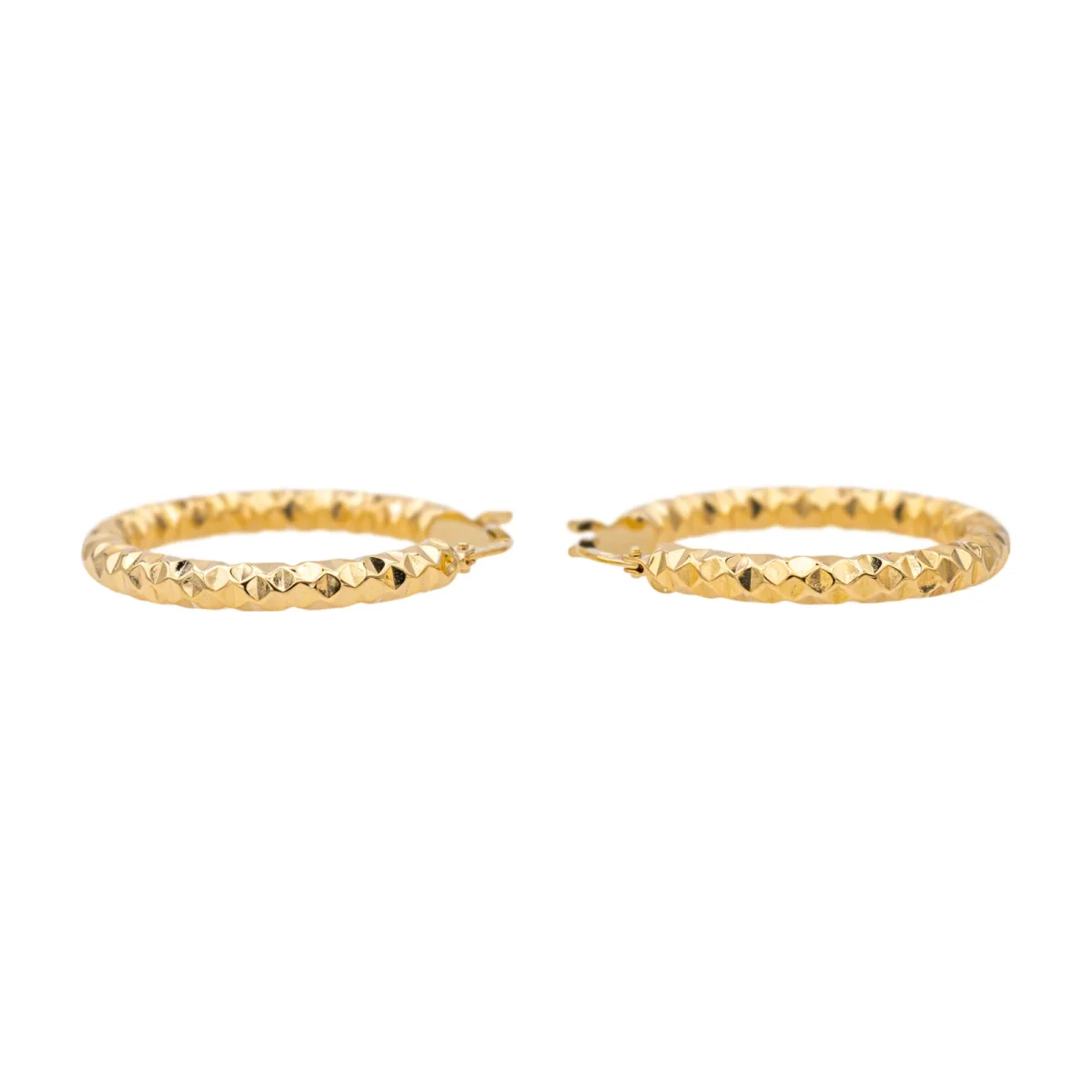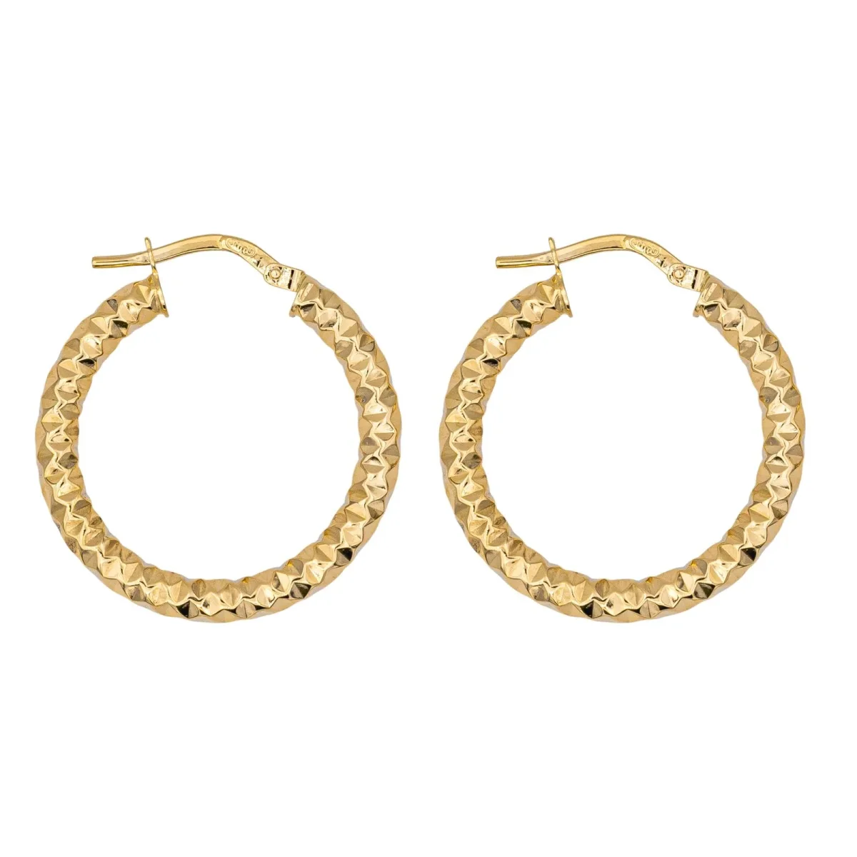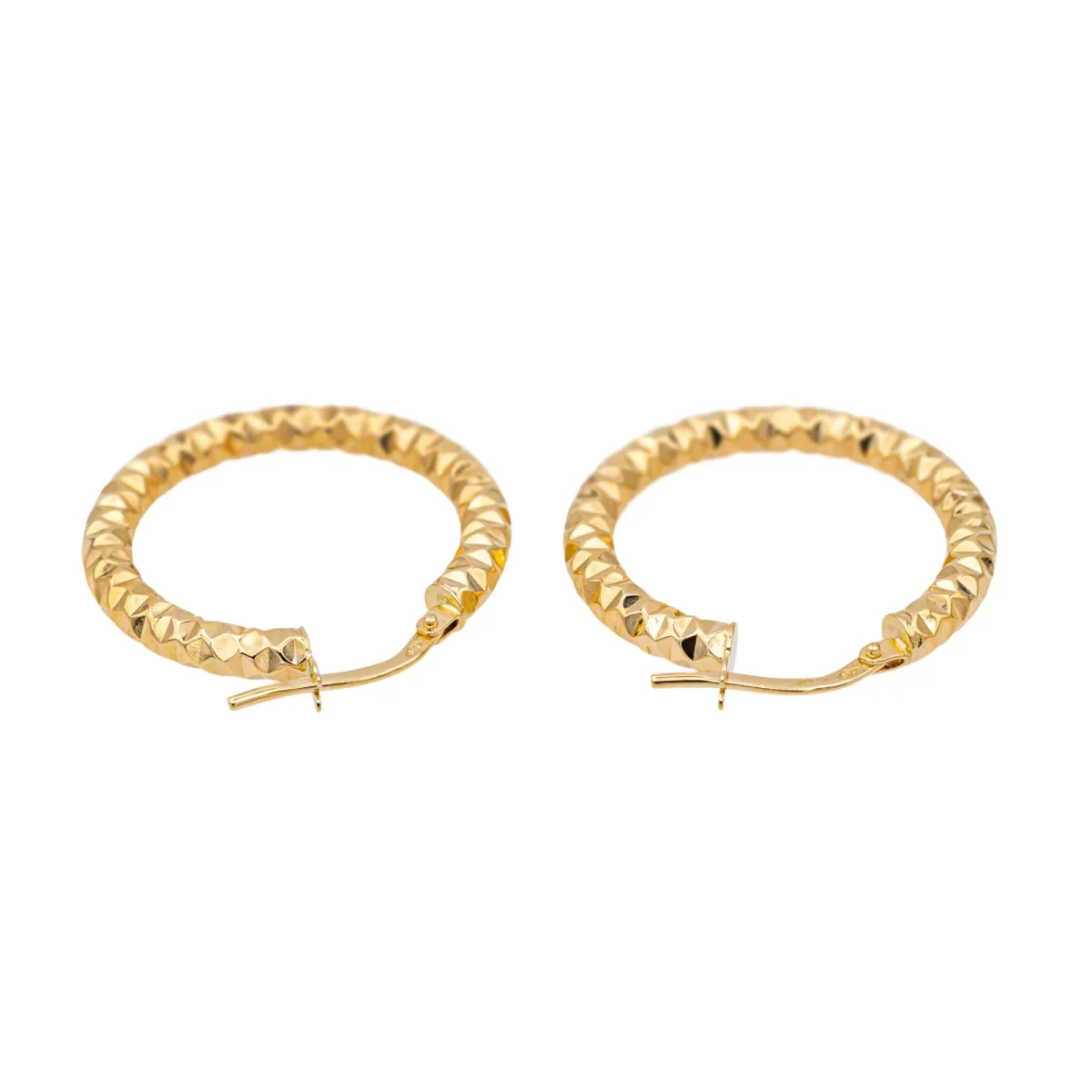 Créoles en or jaune 750 millièmes (18 carats) testé, fil ciselé, longueur: 2,50 cm, diamètre intérieur : 1,85 cm, largeur : 0,30 cm, poids total : 1,82 g, excellent état