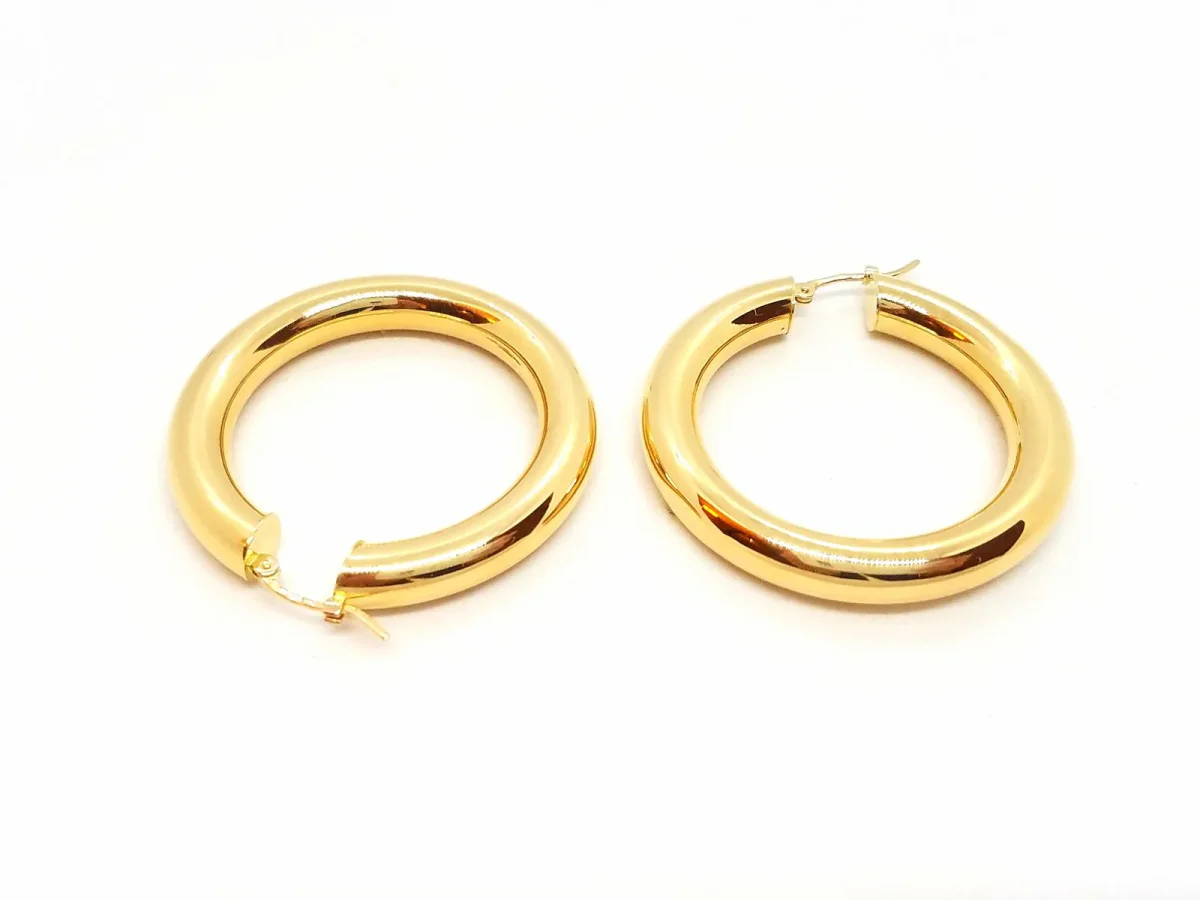Créoles en or jaune 750 millièmes (18 carats), fil rond, diamètre: 3,45 cm, largeur: 0,5 cm, poids total: 6,12 g, poinçon tête d’aigle sur la tige, excellent état