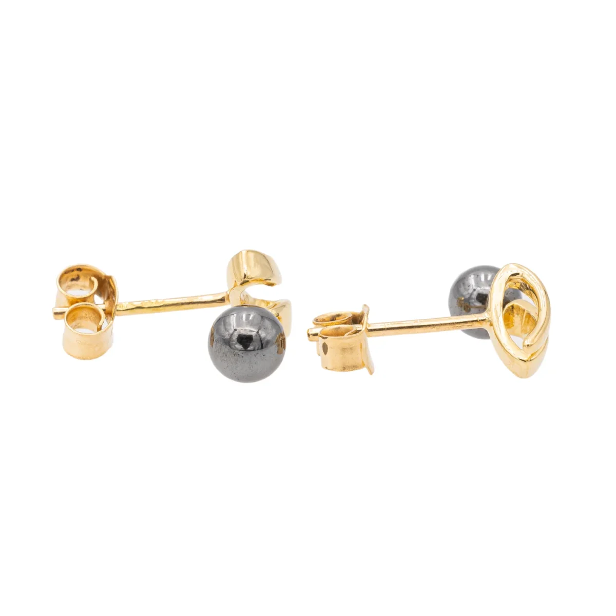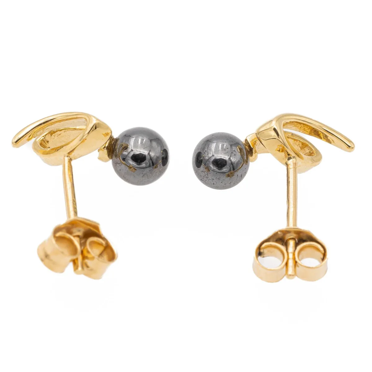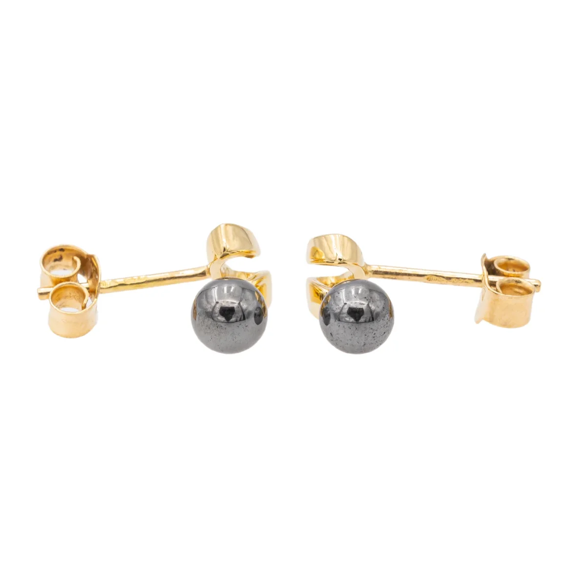 Boucles d’oreilles puces en or jaune 750 millièmes (18 carats) testé, sertie de deux perles d’hématite, diamètre d’une perle: 0,4 cm, dimensions: 1,16 cm x 0,55 cm, poids total: 1,58 g, excellent état