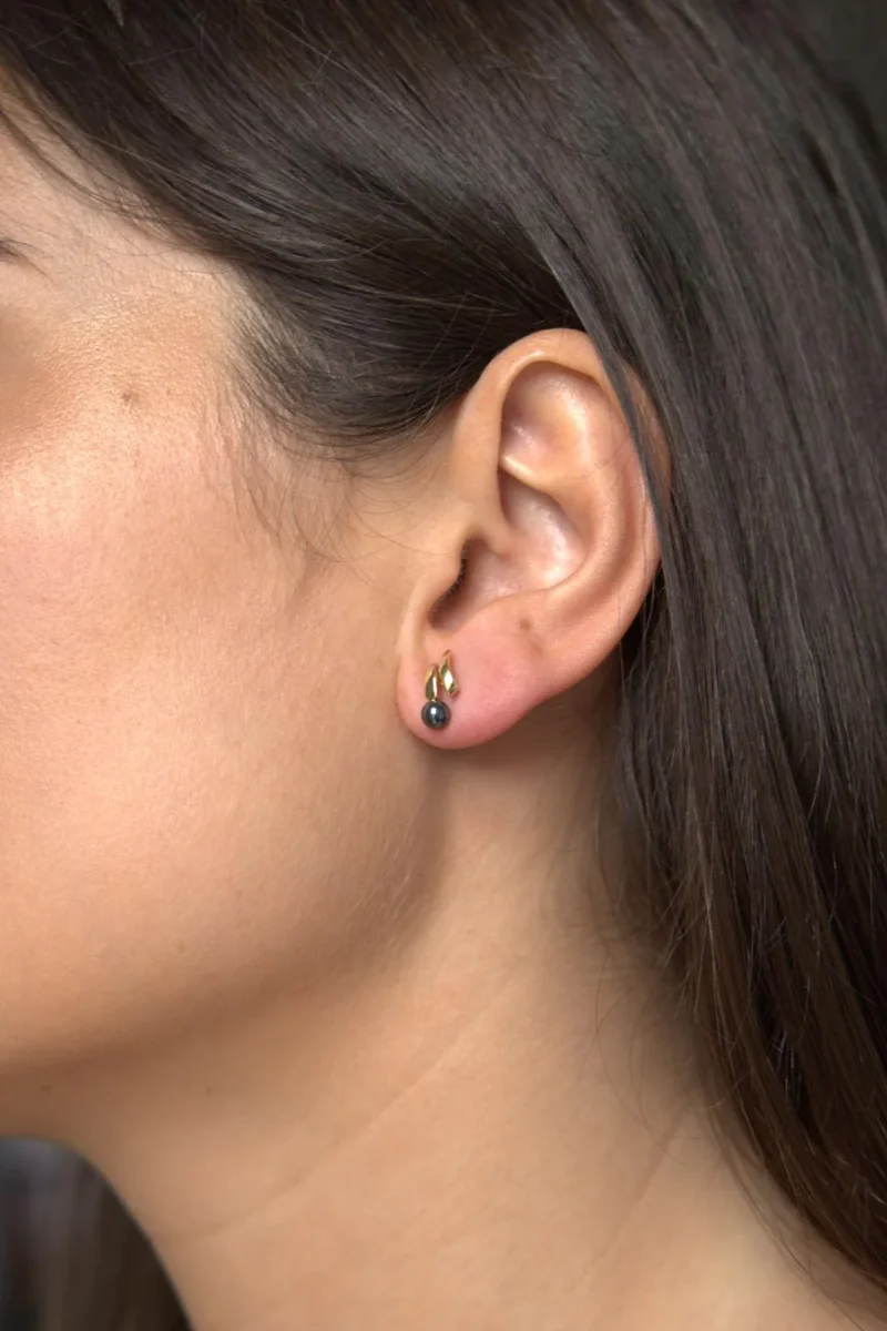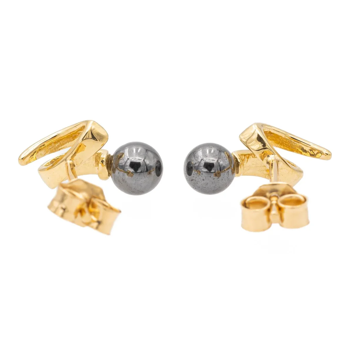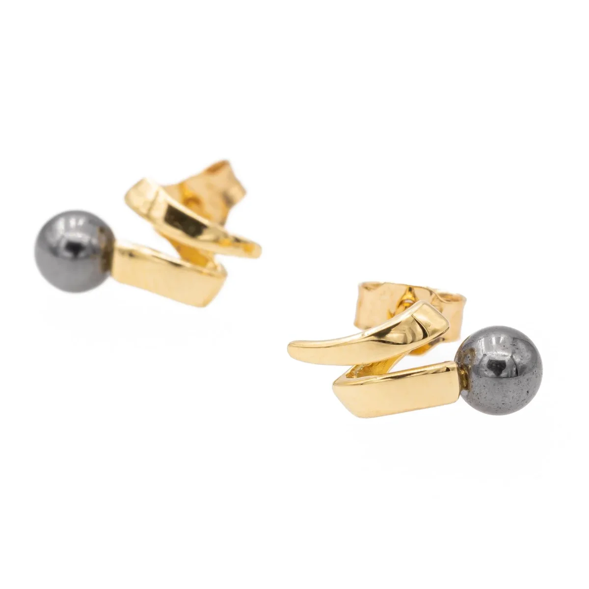 Boucles d’oreilles puces en or jaune 750 millièmes (18 carats) testé, sertie de deux perles d’hématite, diamètre d’une perle: 0,4 cm, dimensions: 1,16 cm x 0,55 cm, poids total: 1,58 g, excellent état