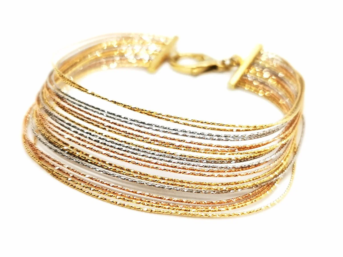 Bracelet 3 ors, en or 750 millièmes (18 carats), composé de 20 fils d’or facettés, 8 fils en or jaune, 6 fils en or blanc, et 6 fils en or rose, taille: 20, 5 cm, largeur totale: 1,7 cm, largeur d’un fil: 0,06 cm, poids total: 18,22 g, poinçon tête d’aigle à demi effacé, excellent état