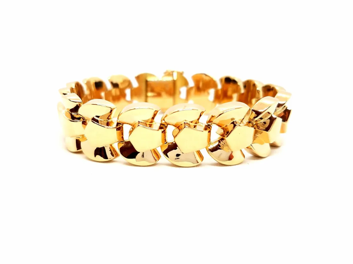 Bracelet art déco, en or rose 750 millièmes (18 carats), articulé, longueur: 17,5 cm, largeur: 1,5 cm, épaisseur: 0,43 cm, poids total: 32,55 g, poinçon tête d’aigle, excellent état