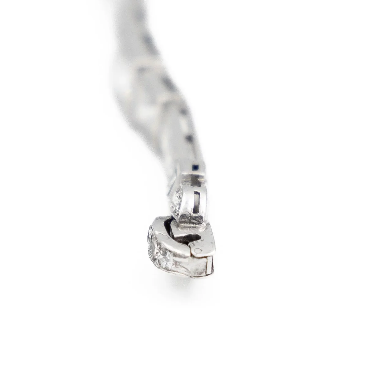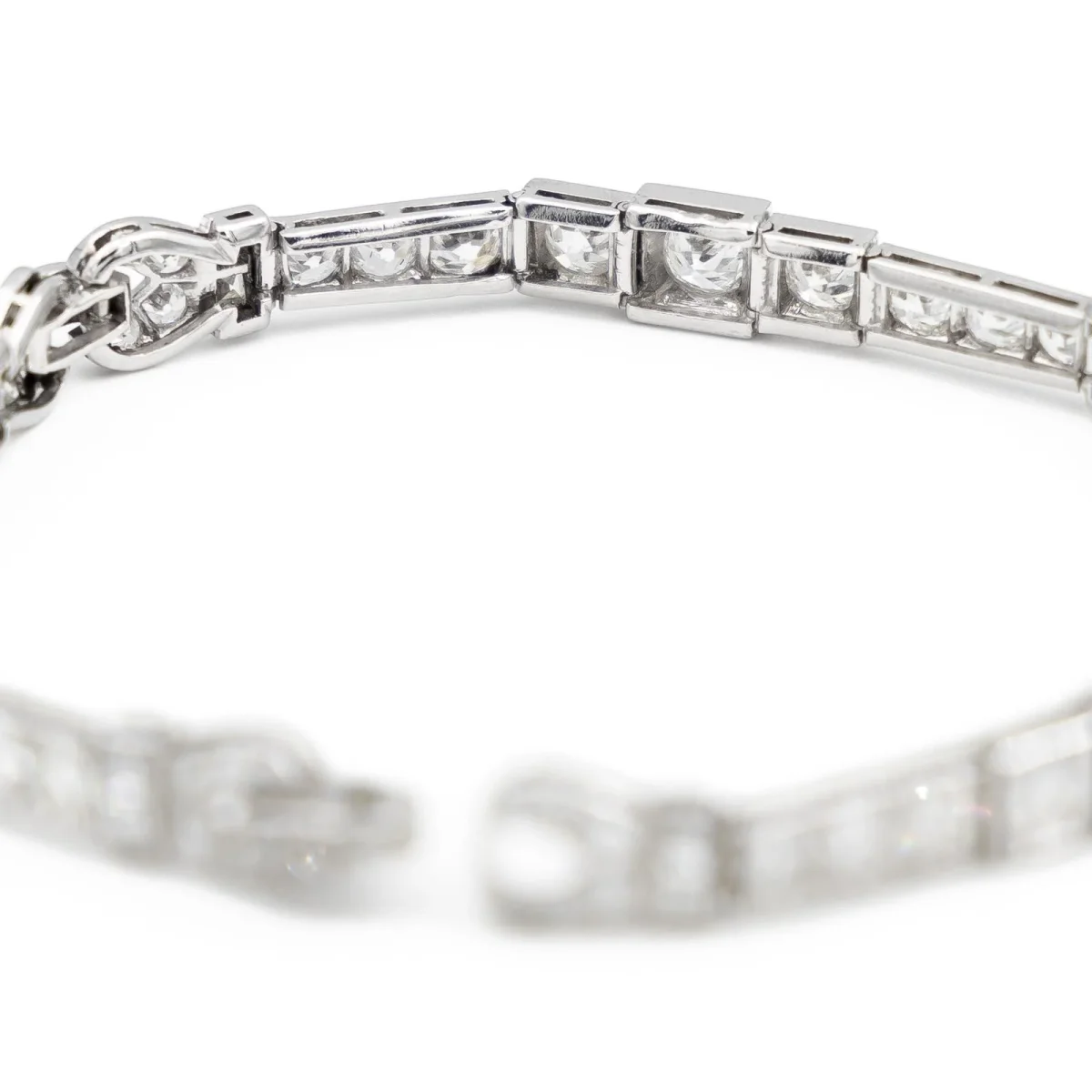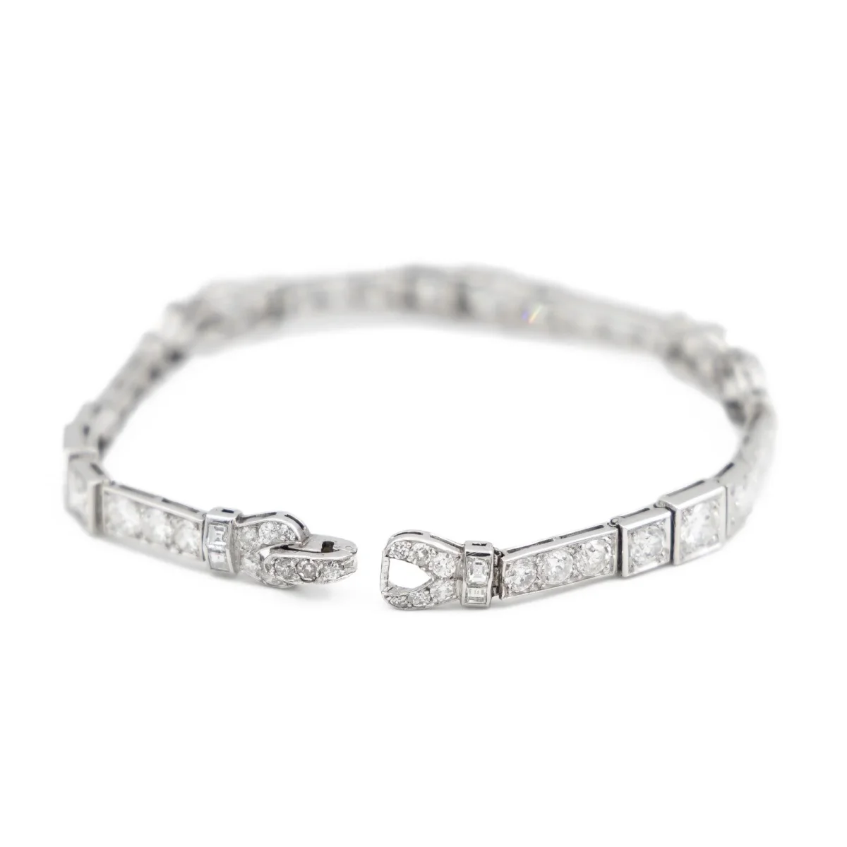 Bracelet Art déco en platine 950 millièmes, serti de 83 diamants, estimés G/VS, dont 12 de taille baguette carrée environ 0,10 ct chacun, les autres sont de taille ancienne, 3 d’environ 0,28 ct chacun, 12 d’environ 0,12 ct chacun, 12 d’environ 0,08 ct chacun, 32 d’environ 0,05 ct chacun, et 12 d’environ 0,01 ct chacun, Poids total estimé des diamants: 6,16 cts, Longueur: 19 cm, Largeur: 0,70 cm, Poids total: 19,77 g, Poinçon tête de chien, Excellent état