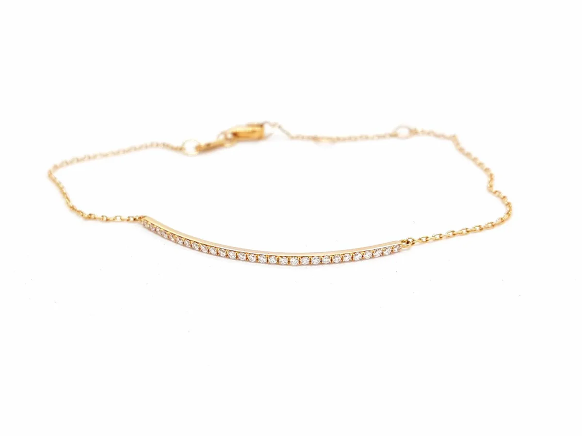 Bracelet chaînette en or rose 750 millièmes (18 carats), composé d’une barrette sertie de 28 diamants taille brillant F-VS pour 0,21 ct au total, longueur: 18,5 cm avec anneaux intermédiaires à 17 cm et 15,5 cm, dimensions de la barrette: 3,5 cm x 0,12 cm, poids total: 1,61 g, poinçon tête d’aigle sur l’anneau de bout, état neuf