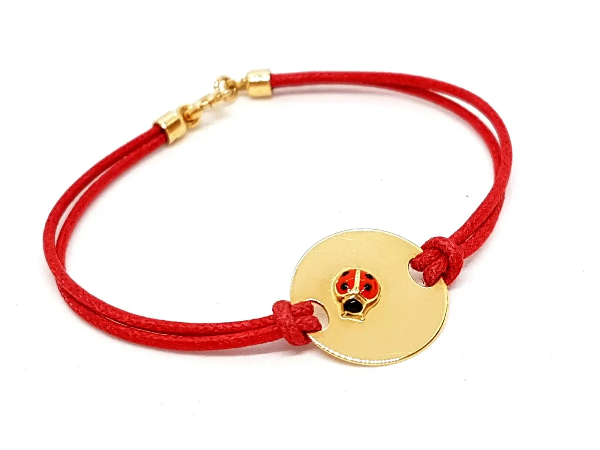 Bracelet double cordon rouge, plaque ronde en or jaune 750 millièmes (18 carats) de 1,5 cm de diamètre avec une coccinelle en relief (hauteur du motif: 0,17 cm), fermoir or jaune 750 millièmes (18 carats), longueur: 13,5 cm, taille enfant ou petit poignet, poids total: 2,02 g, état neuf