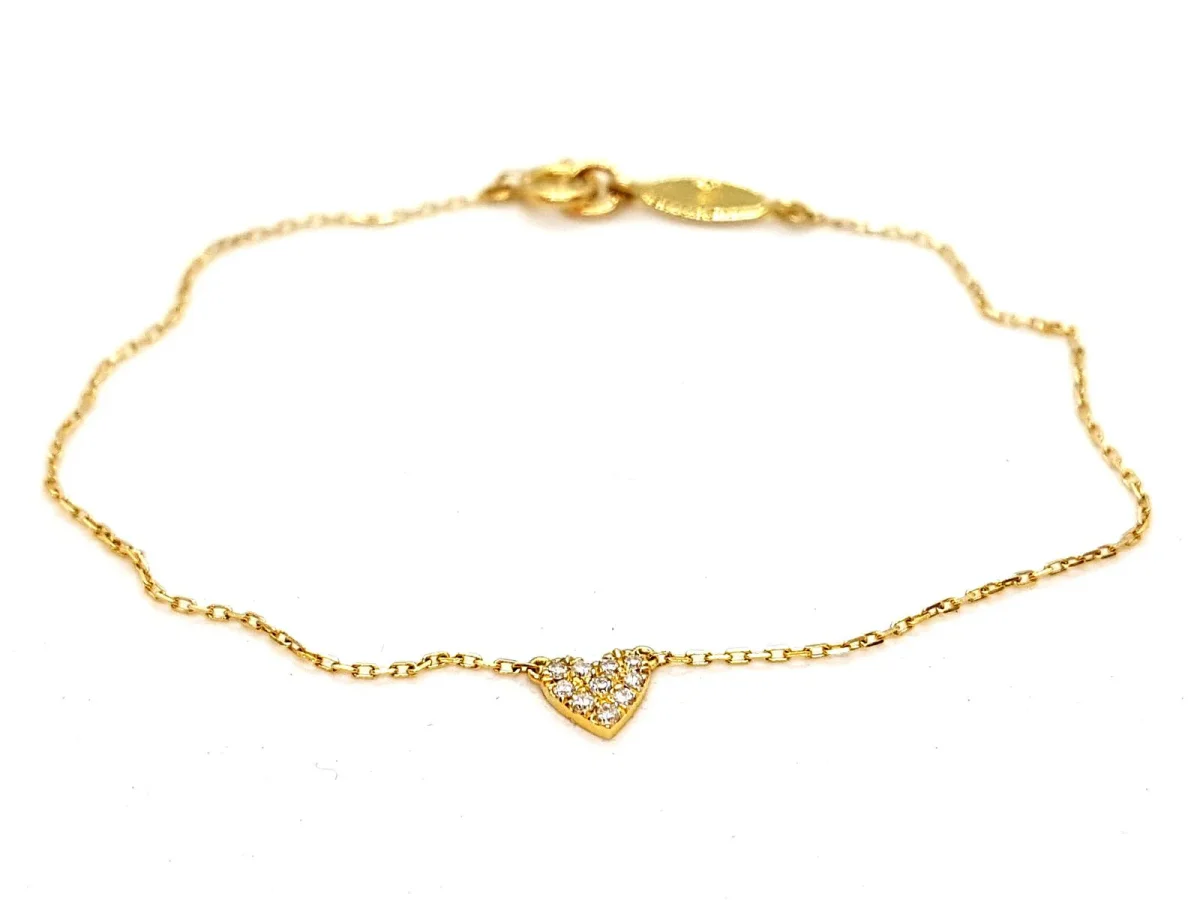 Bracelet en or jaune 750 millièmes (18 carats), avec coeur pavé de 10 diamants taille brillant H-SI pour 0,05 ct au total, longueur: 16,5 cm, dimensions du coeur: 0,5 cm x 0,5 cm, poids total: 0,93 g, excellent état