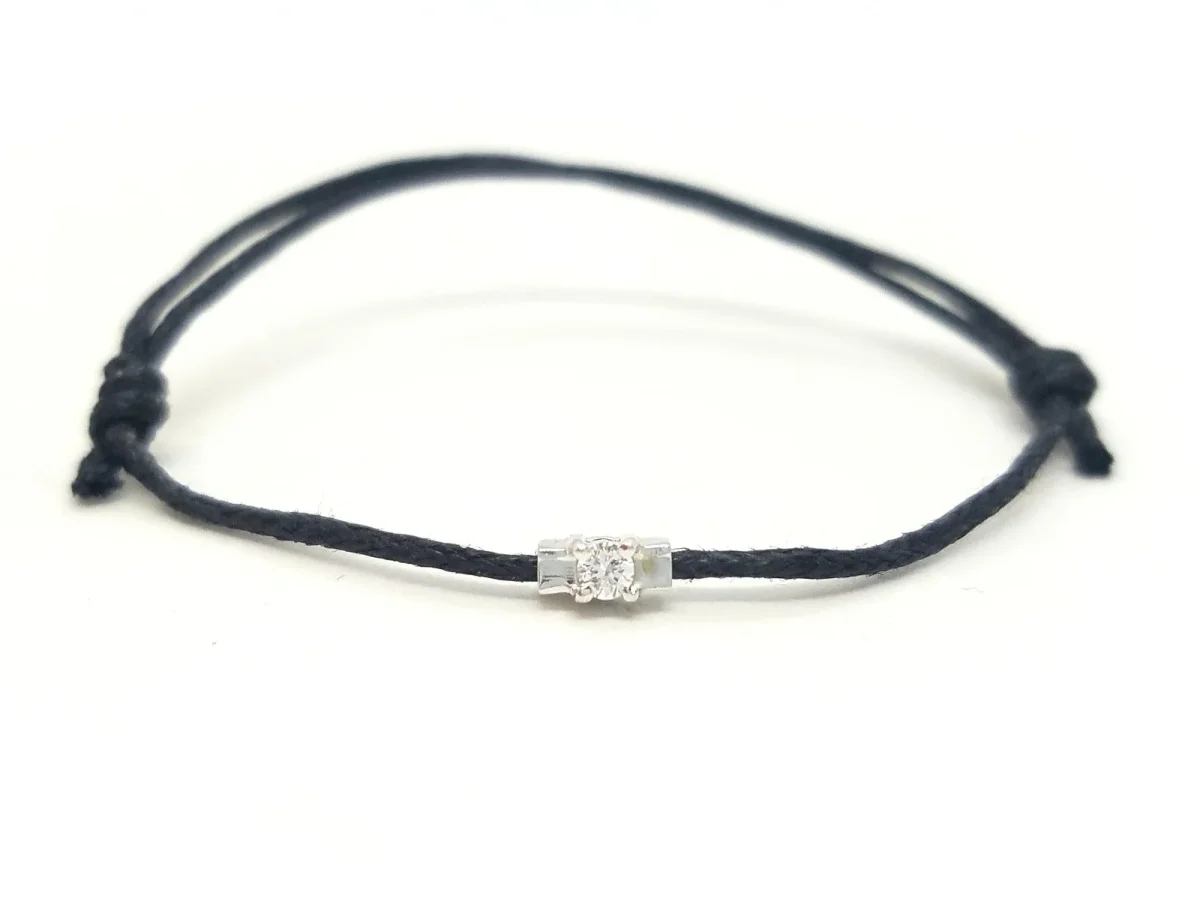 Bracelet cordon noir, composé d’un motif en or blanc 750 millièmes (18 carats) serti d’un diamant taille brillant G-VS de 0,06 ct, dimension du motif: 0,54 cm x 0,26 cm, poids en or: 0,24 g, poids total: 0,42 g, taille ajustable, état neuf