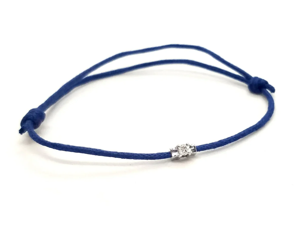 Bracelet cordon bleu foncé, composé d’un motif en or blanc 750 millièmes (18 carats) serti d’un diamant taille brillant G-VS de 0,04 ct, dimension du motif: 0,54 cm x 0,26 cm, poids en or: 0,35 g, poids total: 0,42 g, taille ajustable, état neuf