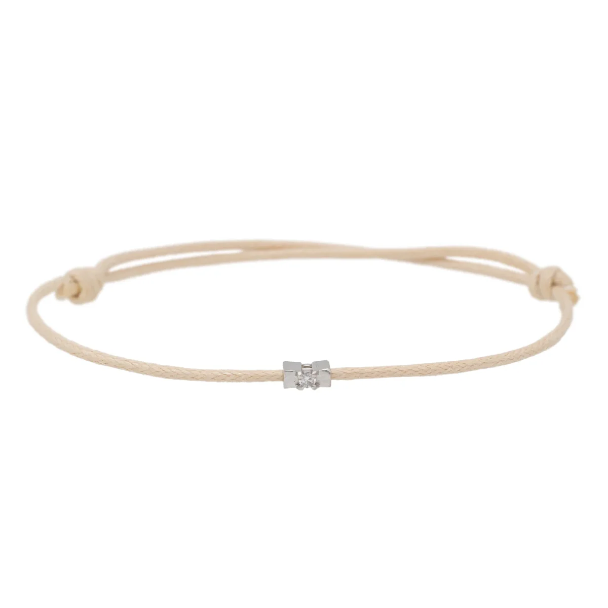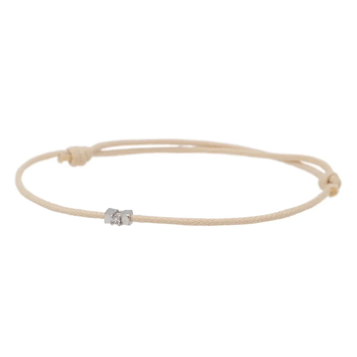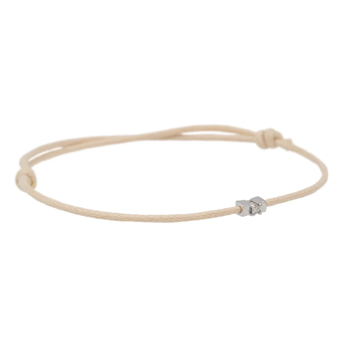 Bracelet cordon beige, composé d’un motif en or blanc 750 millièmes (18 carats) serti d’un diamant taille brillant G-VS de 0,02 ct, dimension du motif: 0,48 cm x 0,22 cm, poids en or: 0,18 g, poids total: 0,45 g, taille ajustable, état neuf
