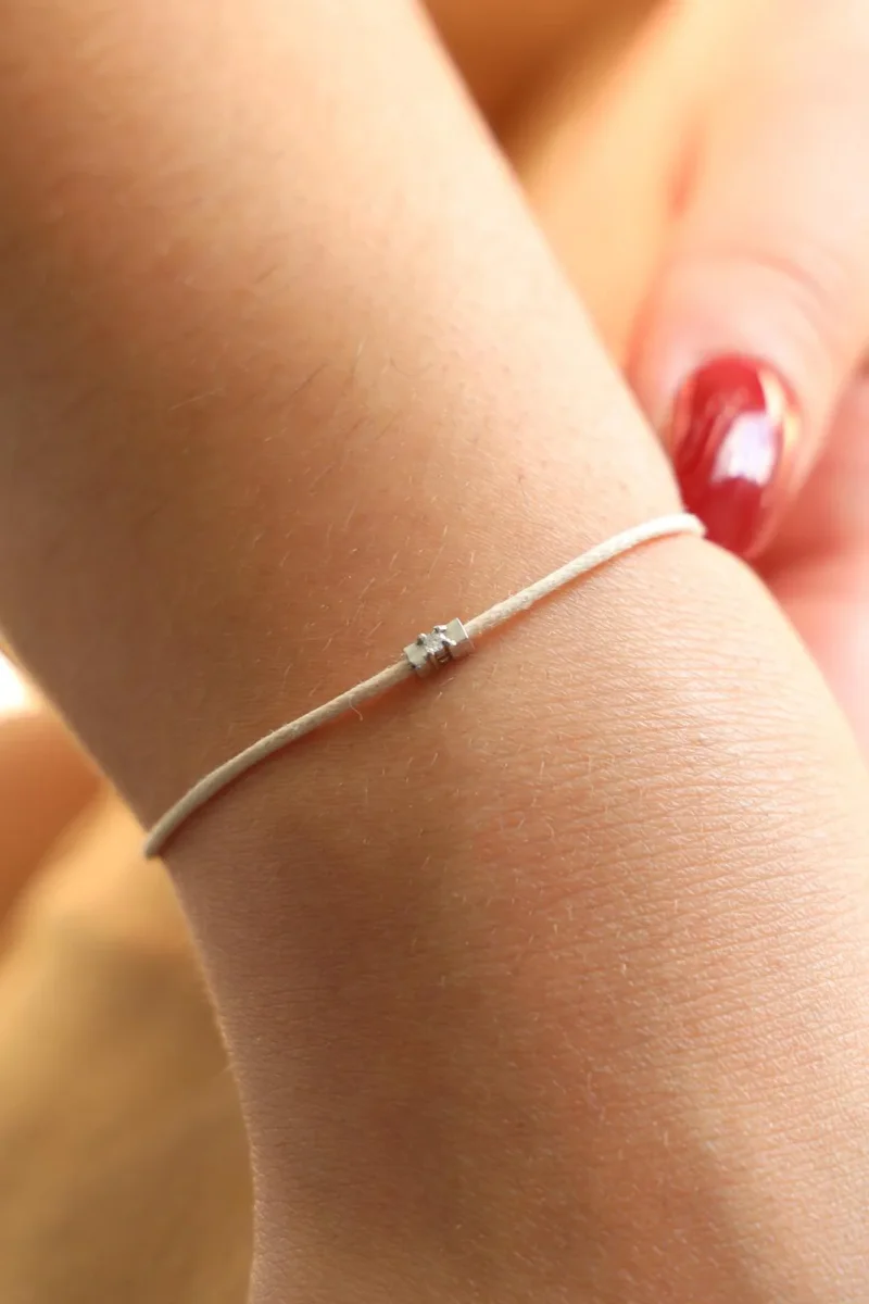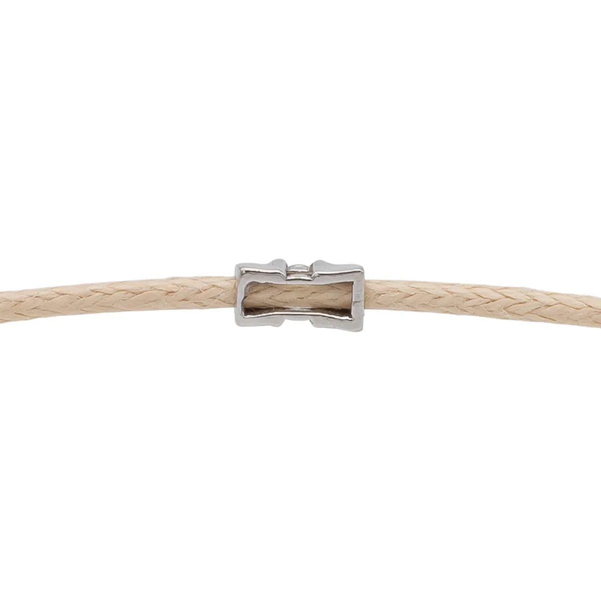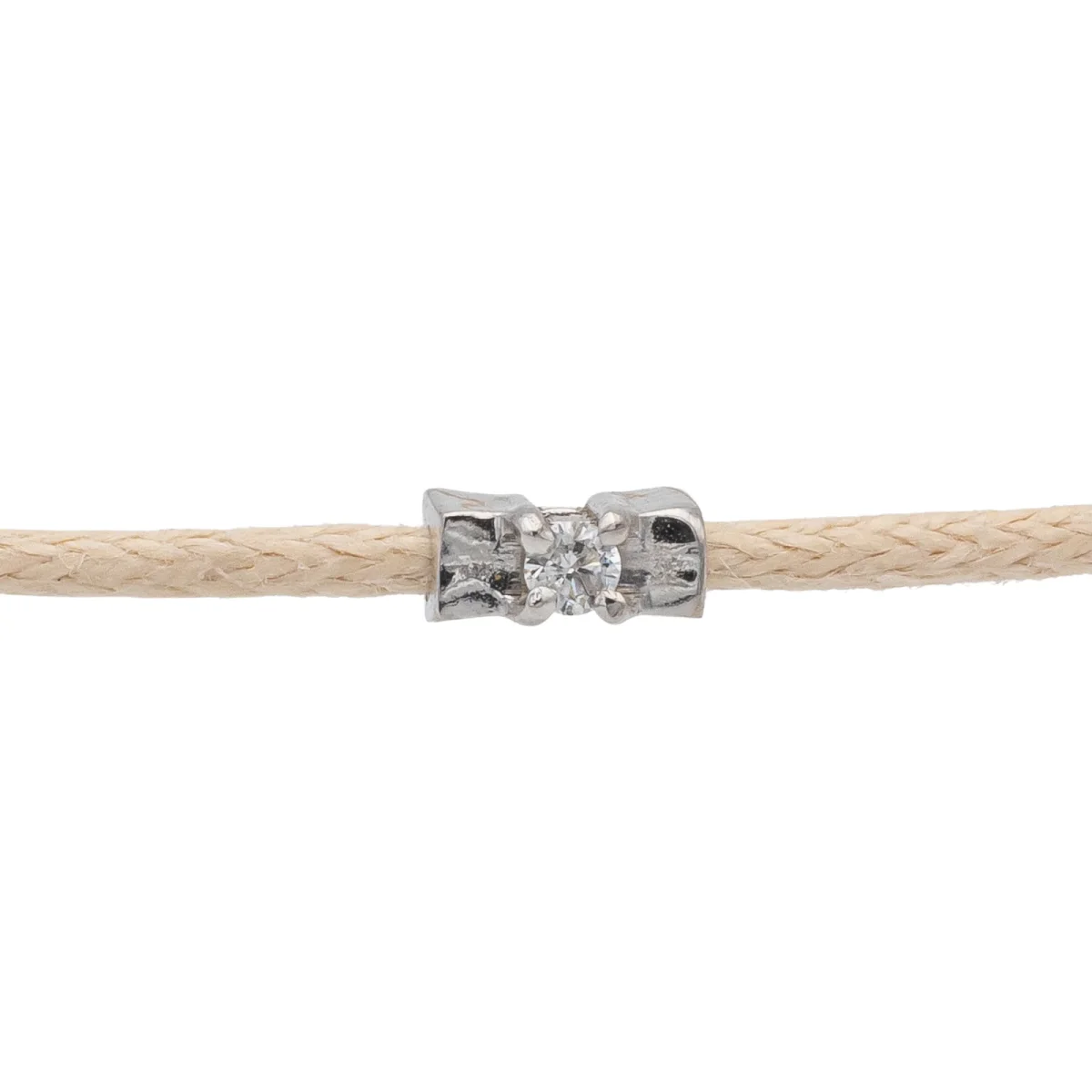 Bracelet cordon beige, composé d’un motif en or blanc 750 millièmes (18 carats) serti d’un diamant taille brillant G-VS de 0,02 ct, dimension du motif: 0,48 cm x 0,22 cm, poids en or: 0,18 g, poids total: 0,45 g, taille ajustable, état neuf