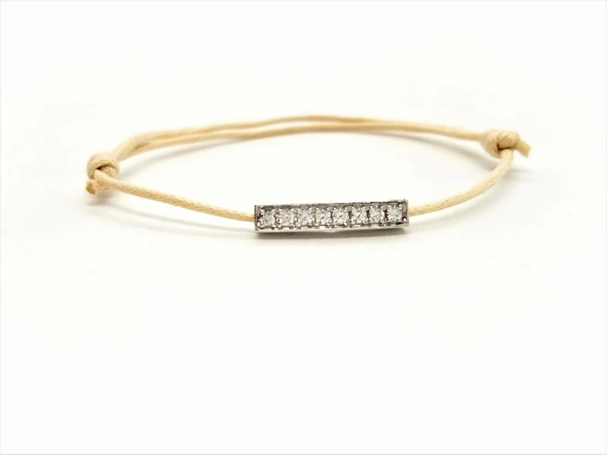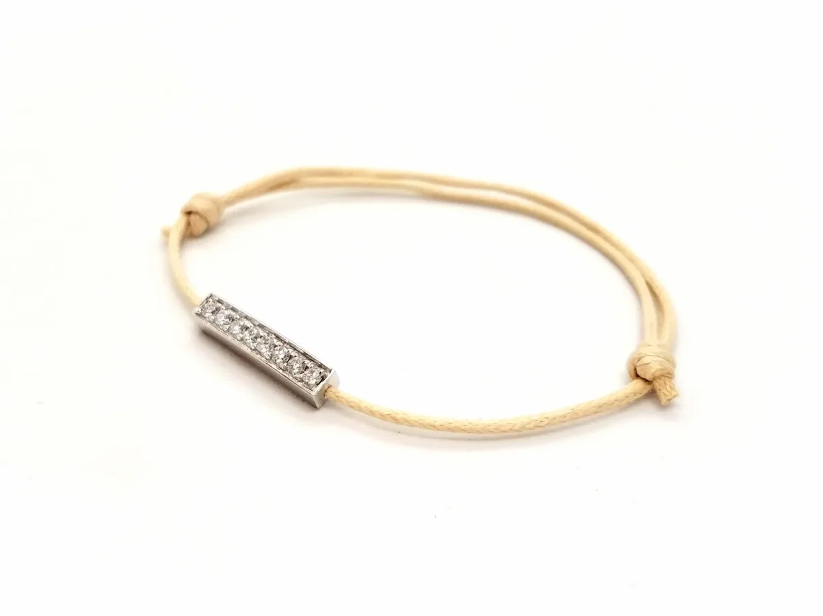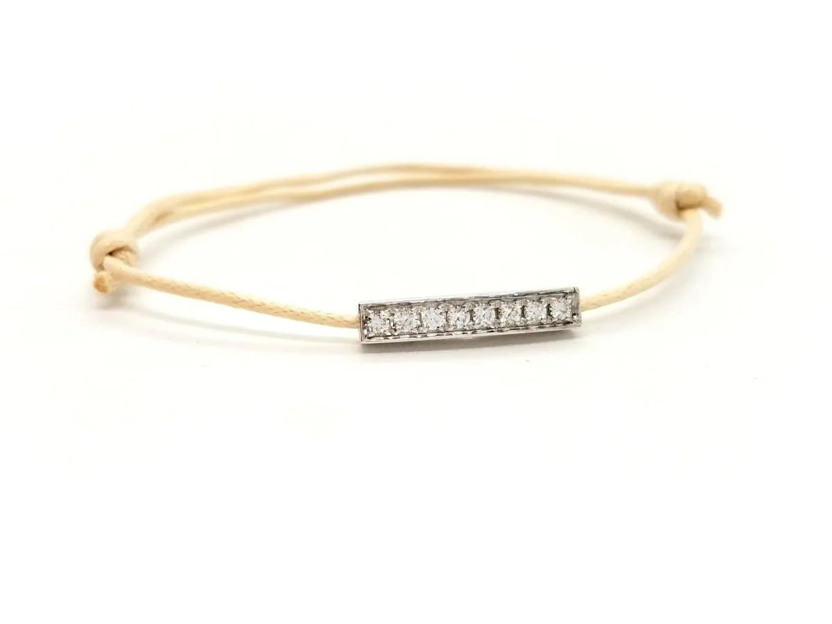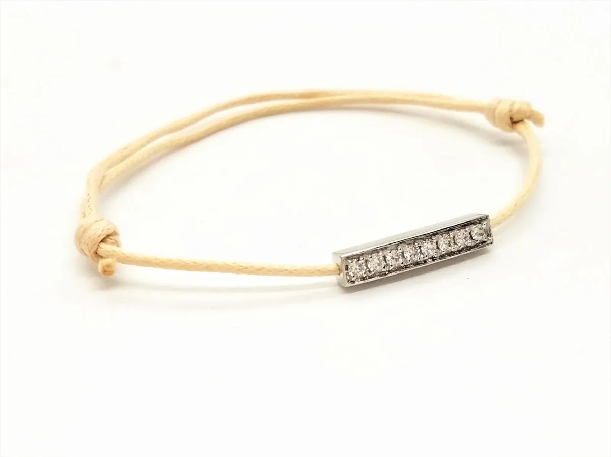 Bracelet cordon beige, composé d’un motif rectangulaire en or blanc 750 millièmes (18 carats), serti de 8 diamants taille brillant G-VS pour un total de 0,16 ct, dimension du motif: 1,69 cm x 0,34 cm, poids en or: 0,84 g, poids total: 1,03 g, taille ajustable, état neuf