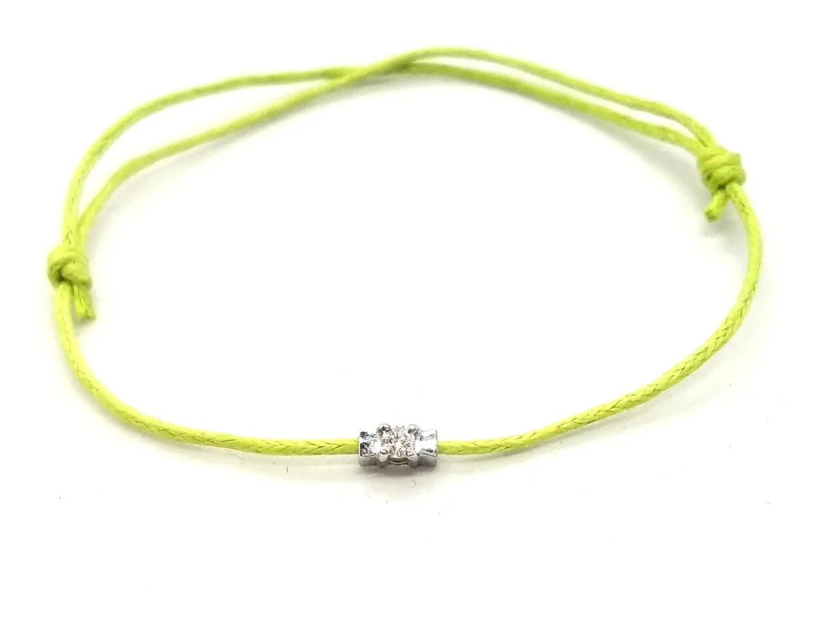 Bracelet cordon vert, composé d’un motif en or blanc 750 millièmes (18 carats) serti d’un diamant taille brillant G-VS de 0,04 ct, dimension du motif: 0,54 cm x 0,26 cm, poids en or: 0,35 g, poids total: 0,37 g, taille ajustable, état neuf