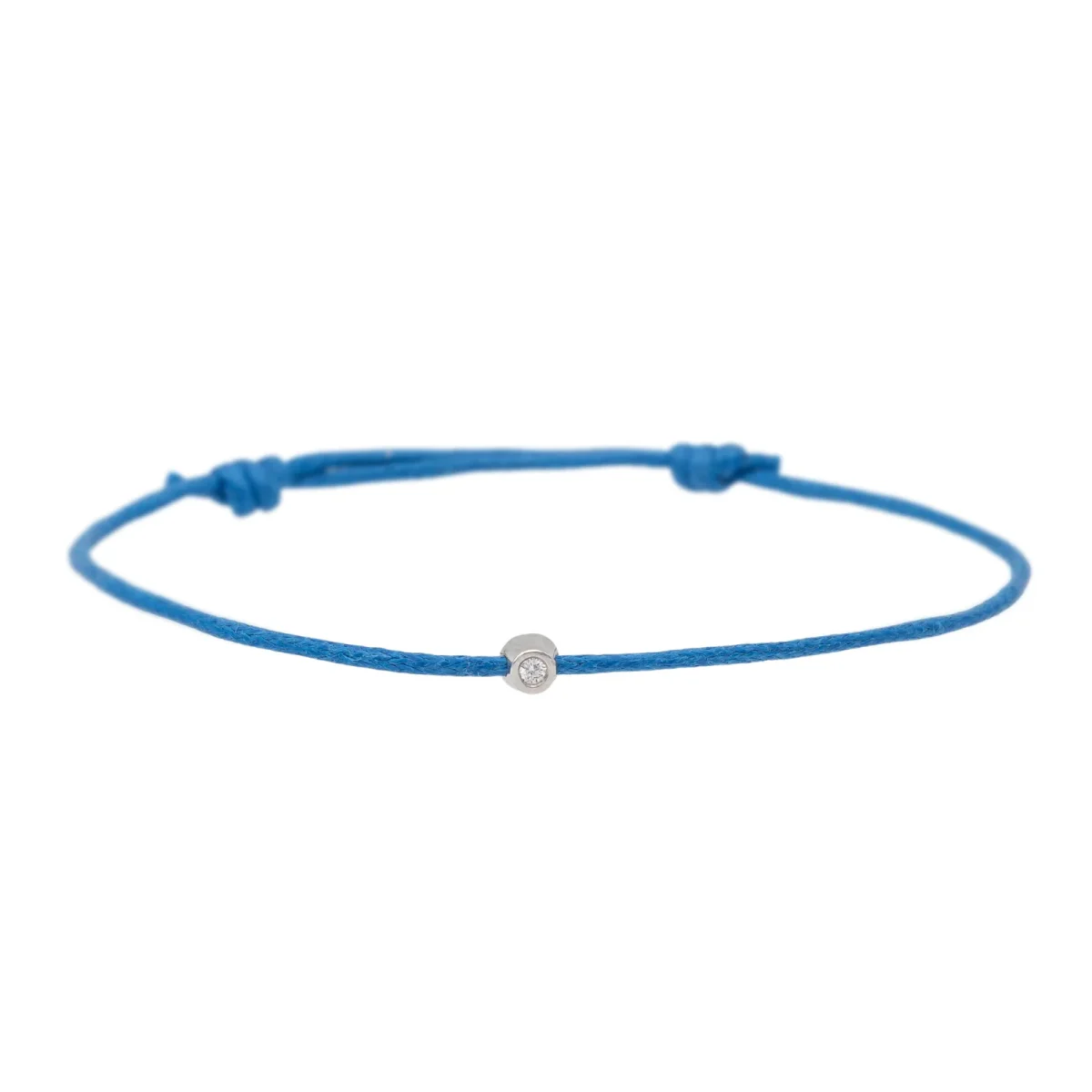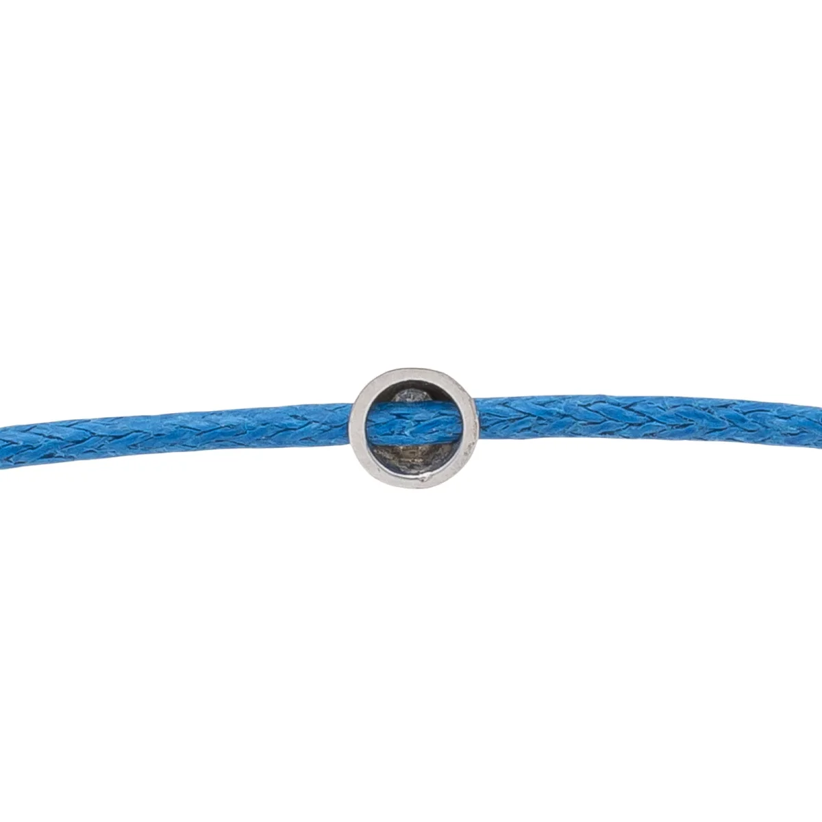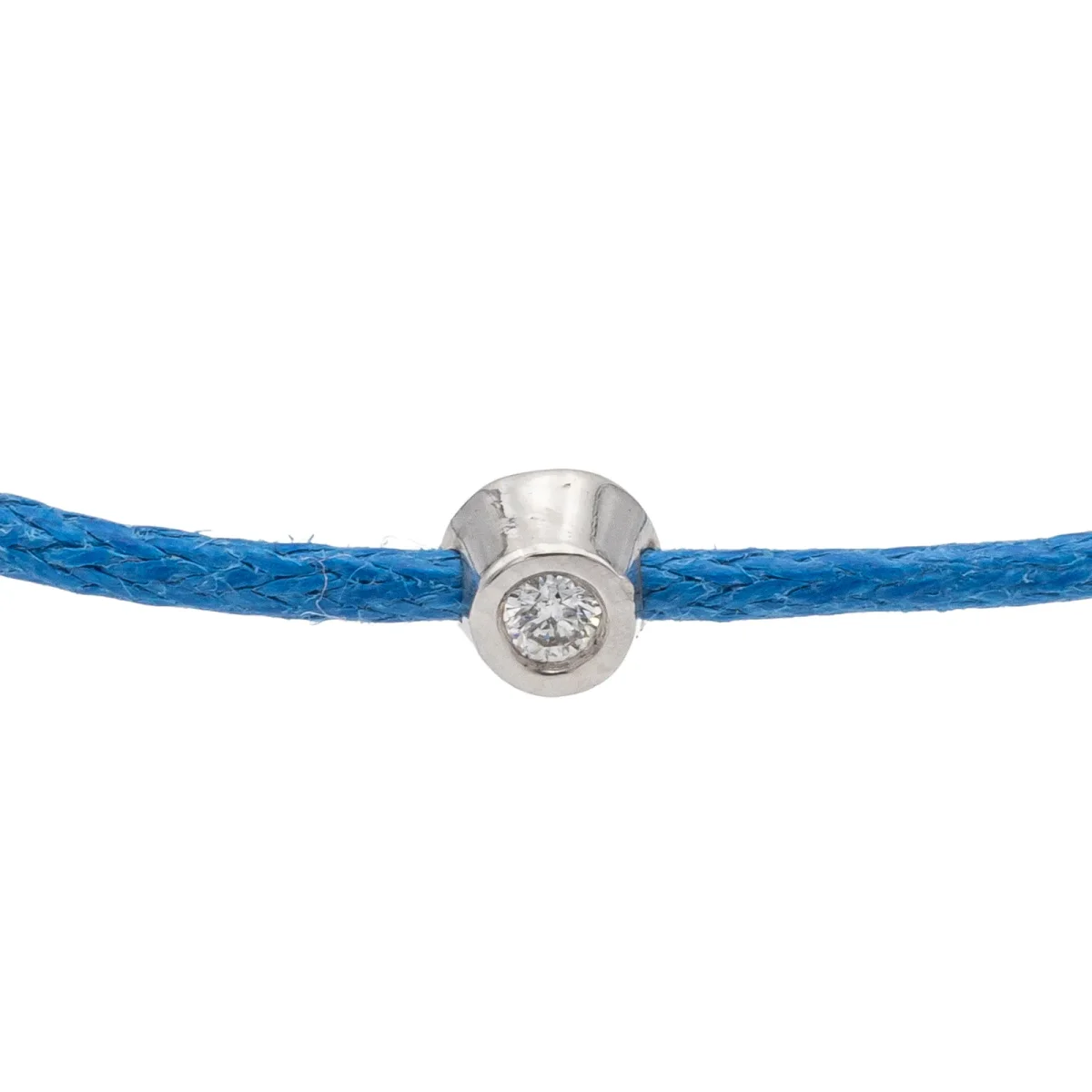 Bracelet cordon bleu, composé d’un motif rond en or blanc 750 millièmes (18 carats) avec un serti clos, diamant taille brillant G-VS pour un total de 0,02 ct, dimension du motif: 0,36 cm, poids en or: 0,13 g, poids total: 0,35 g, taille ajustable, état neuf