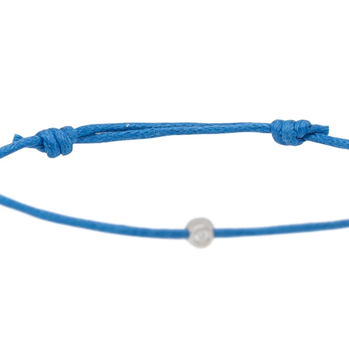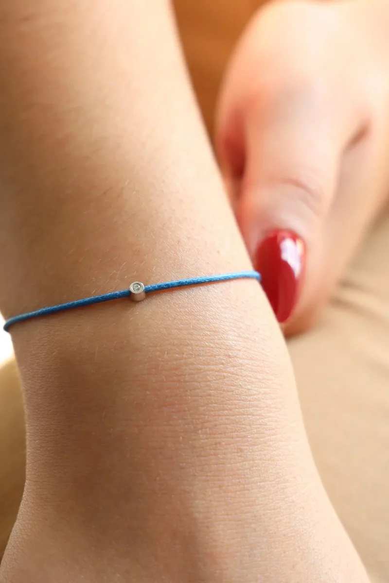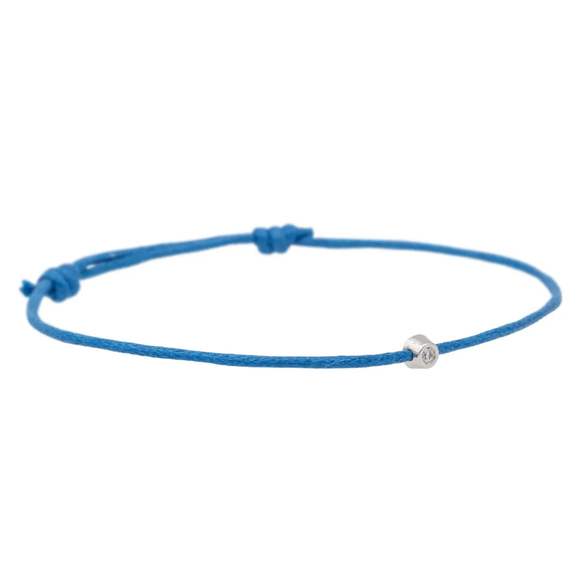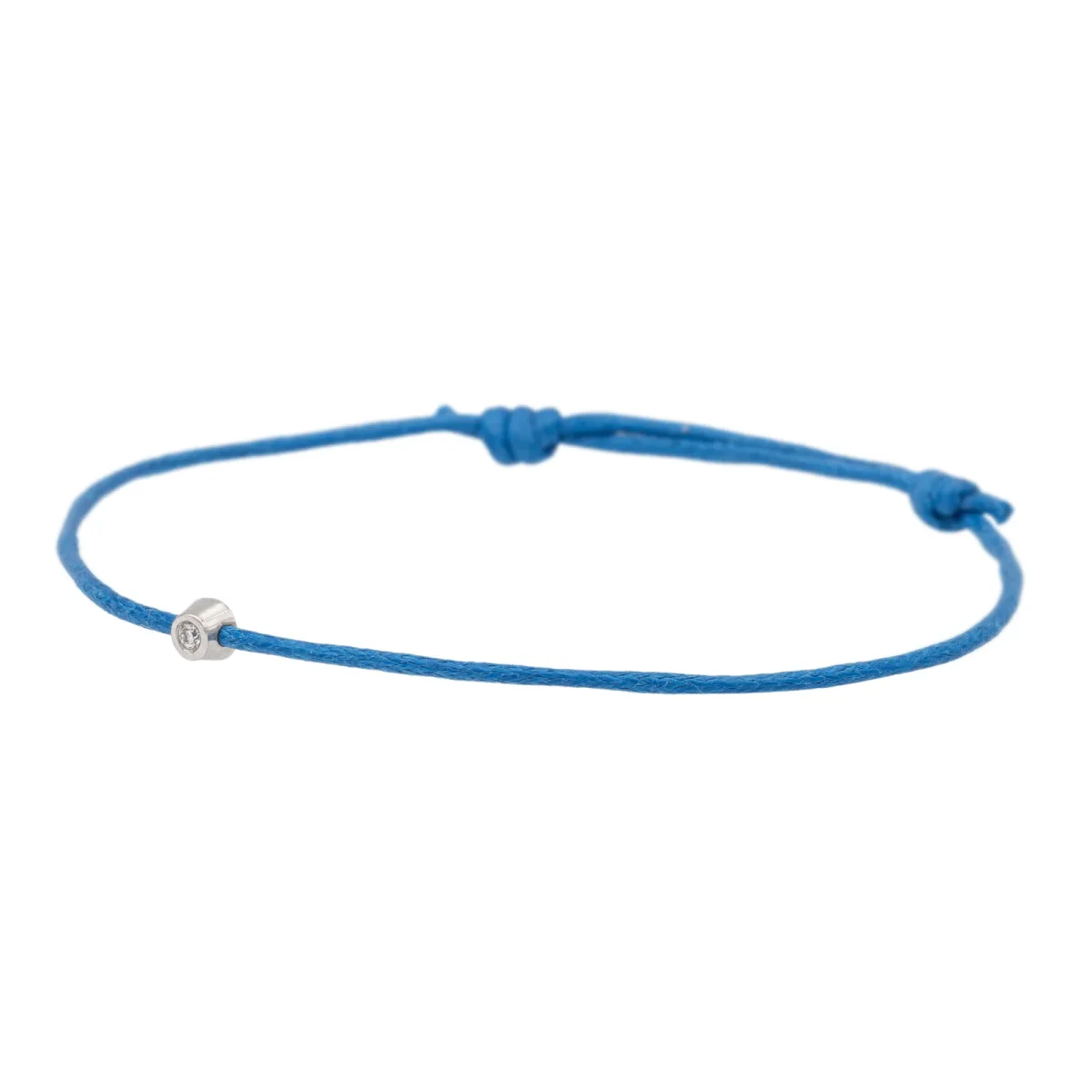 Bracelet cordon bleu, composé d’un motif rond en or blanc 750 millièmes (18 carats) avec un serti clos, diamant taille brillant G-VS pour un total de 0,02 ct, dimension du motif: 0,36 cm, poids en or: 0,13 g, poids total: 0,35 g, taille ajustable, état neuf