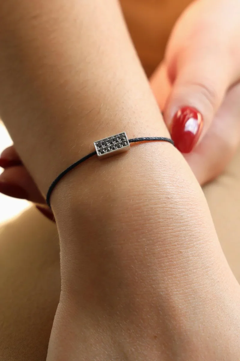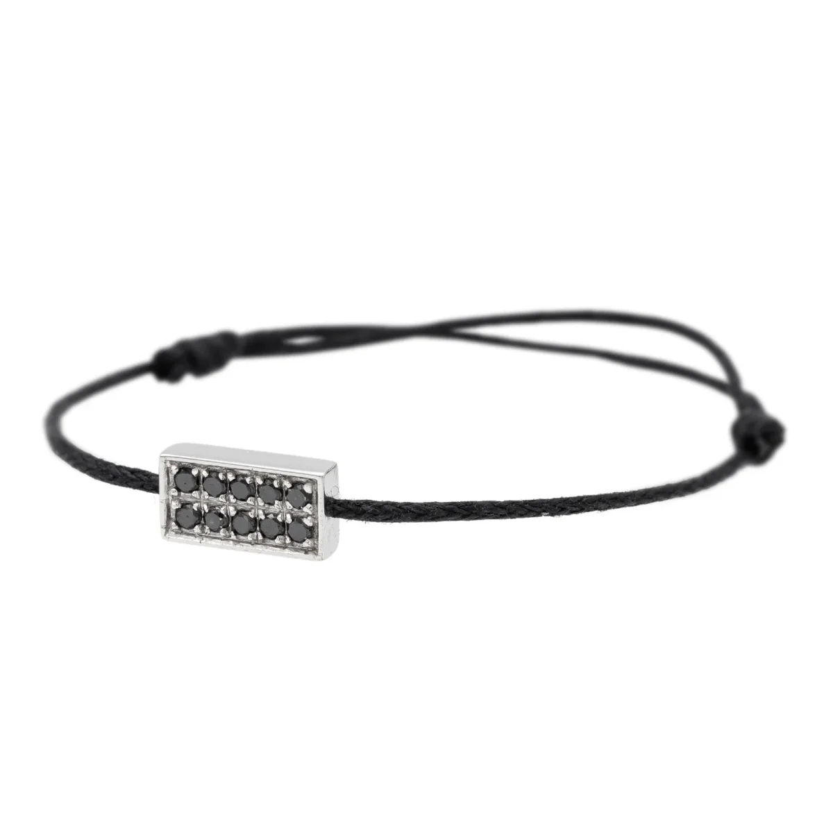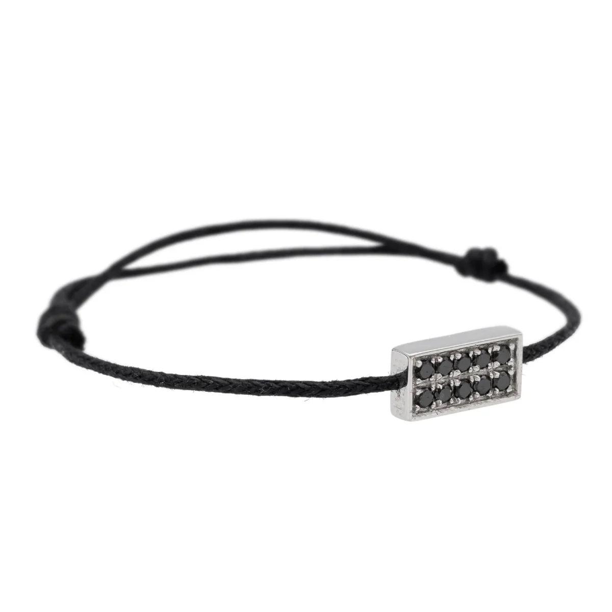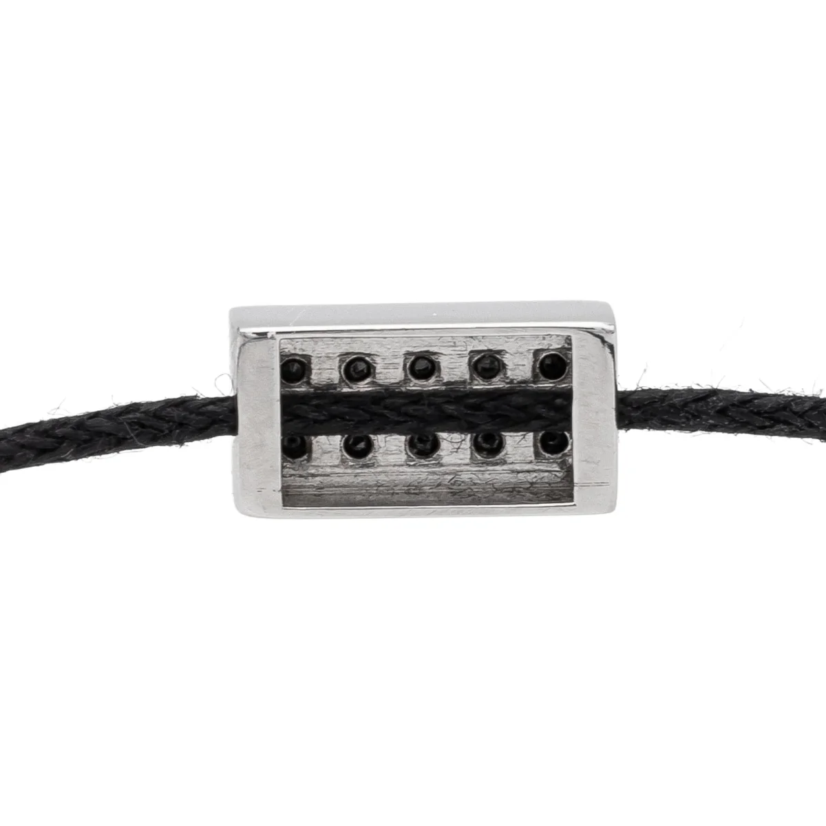 Bracelet cordon noir, composé d’un motif rectangulaire en or blanc 750 millièmes (18 carats), serti de 10 diamants noirs taille brillant pour un total de 0,20 ct, dimension du motif: 1,15 cm x 0,6 cm, poids en or: 1,18 g, poids total: 1,34 g, taille ajustable, état neuf