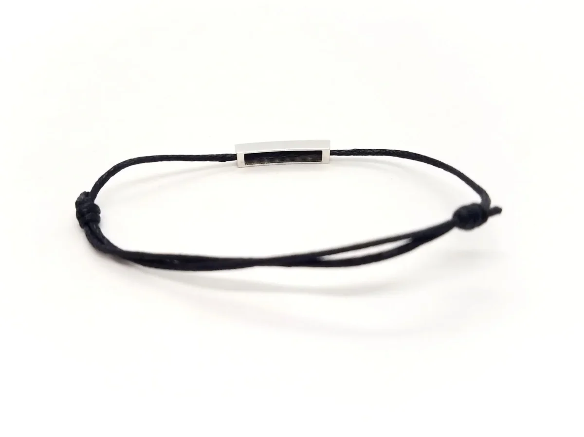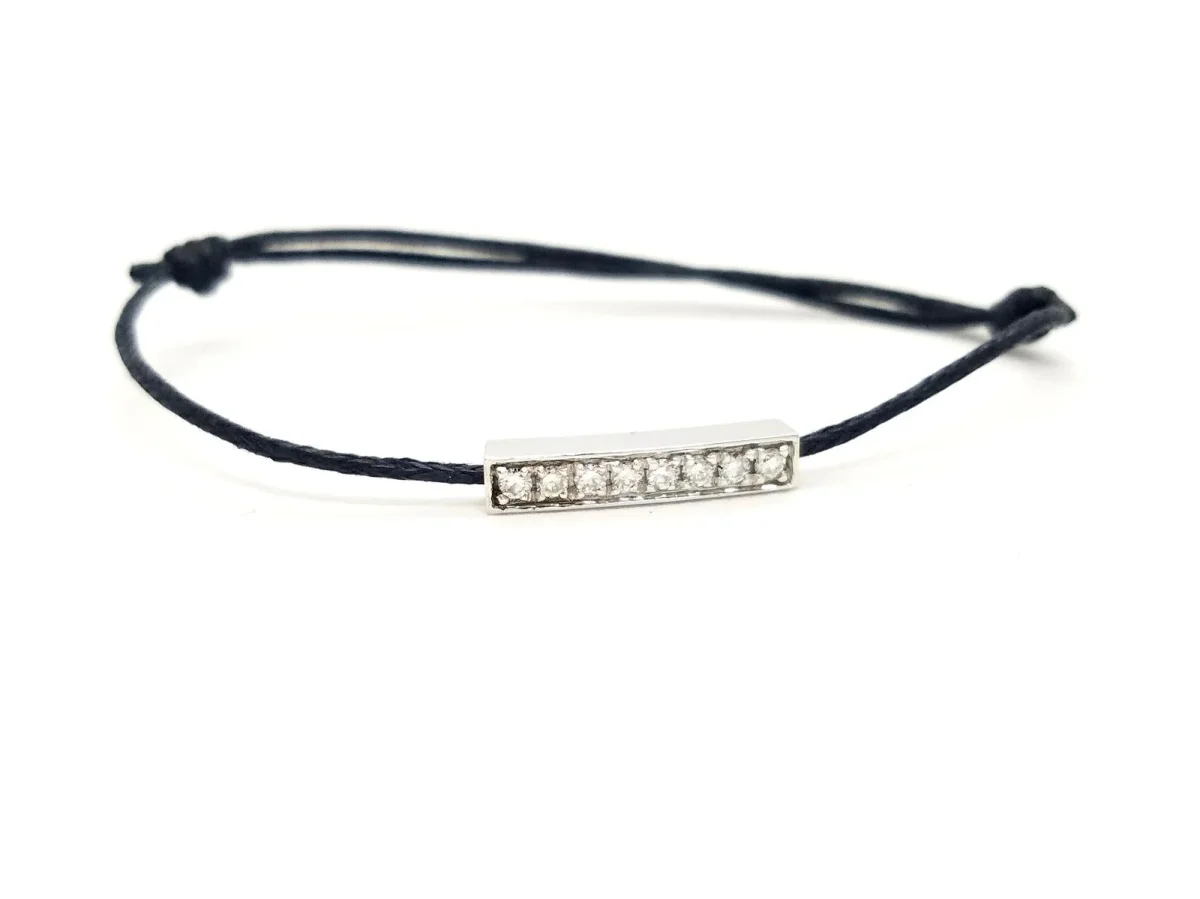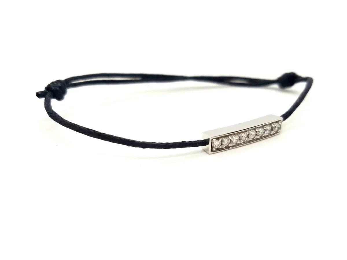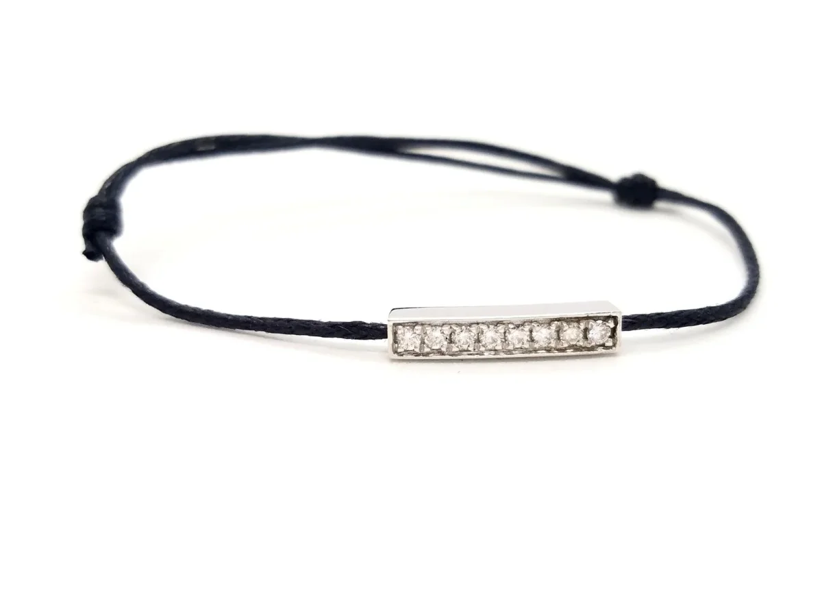 Bracelet cordon noir, composé d’un motif rectangulaire en or blanc 750 millièmes (18 carats), serti de 8 diamants taille brillant G-VS pour un total de 0,16 ct, dimension du motif: 1,69 cm x 0,34 cm, poids en or: 0,84 g, poids total: 0,95 g, taille ajustable, état neuf