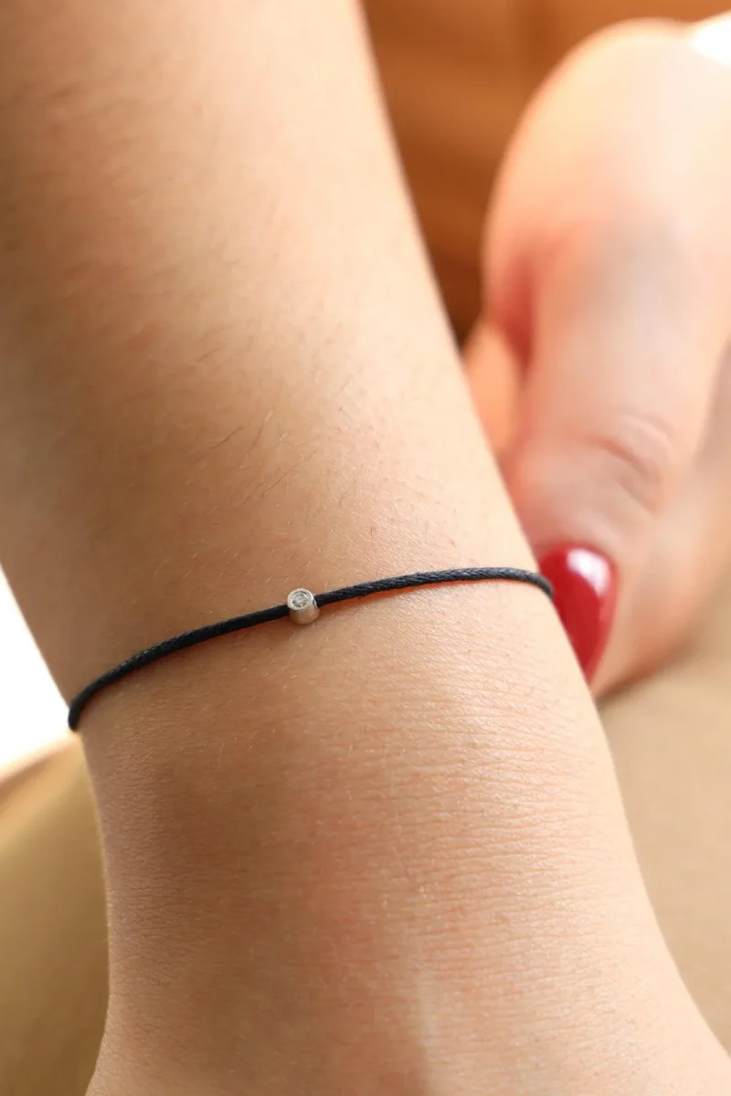 Bracelet cordon noir, composé d’un motif rond en or blanc 750 millièmes (18 carats) avec un serti clos, diamant taille brillant G-VS pour un total de 0,02 ct, dimension du motif: 0,36 cm, poids en or: 0,11 g, poids total: 0,29 g, taille ajustable, état neuf