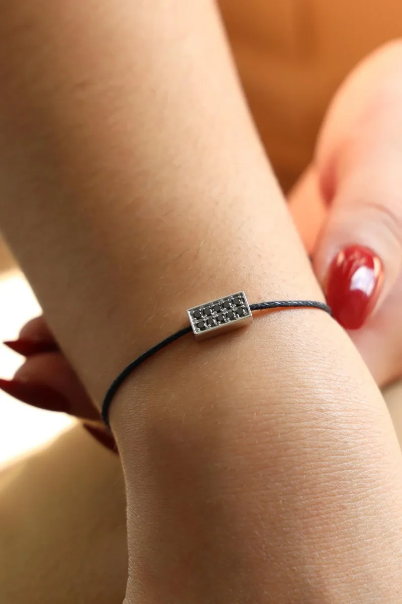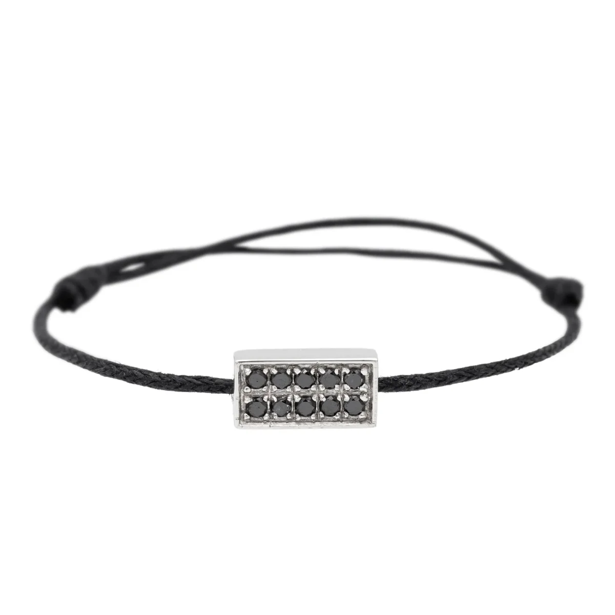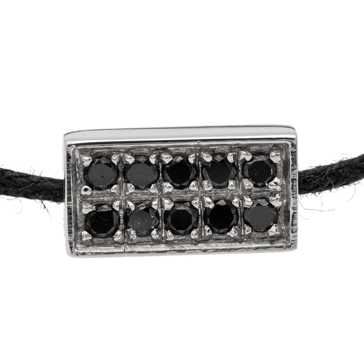Bracelet cordon noir, composé d’un motif rectangulaire en or blanc 750 millièmes (18 carats), serti de 10 diamants noirs taille brillant pour un total de 0,20 ct, dimension du motif: 1,15 cm x 0,6 cm, poids en or: 1,22 g, poids total: 1,38 g, taille ajustable, état neuf