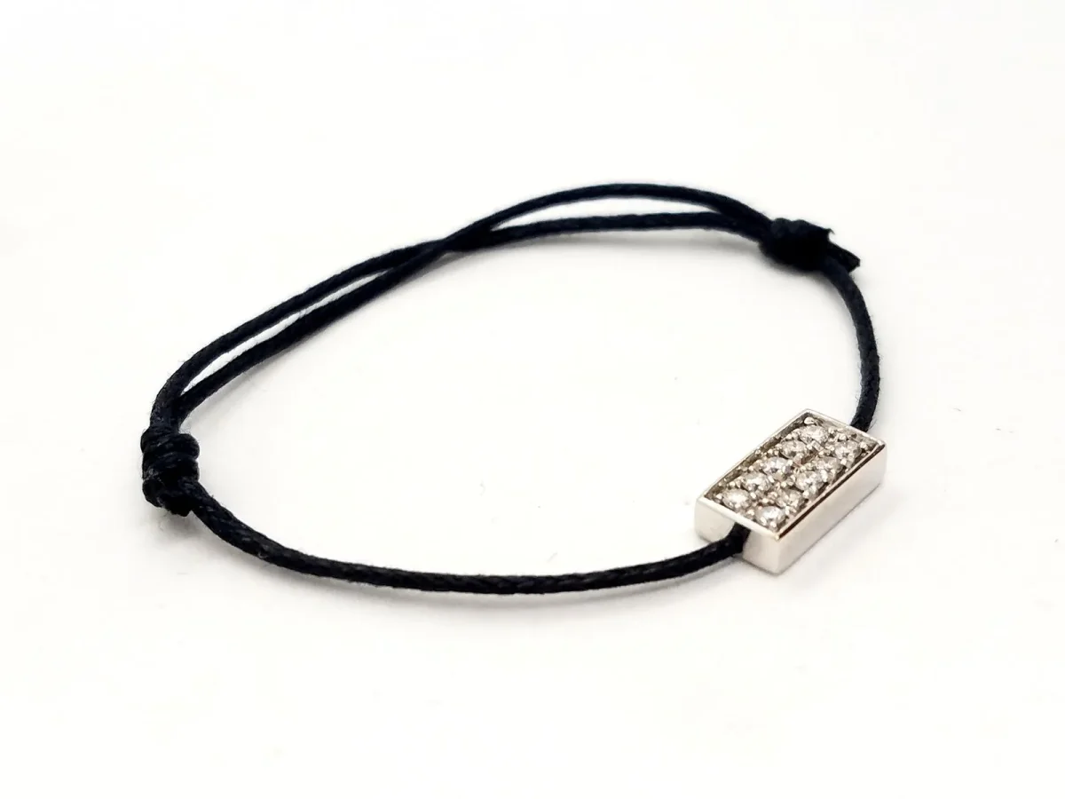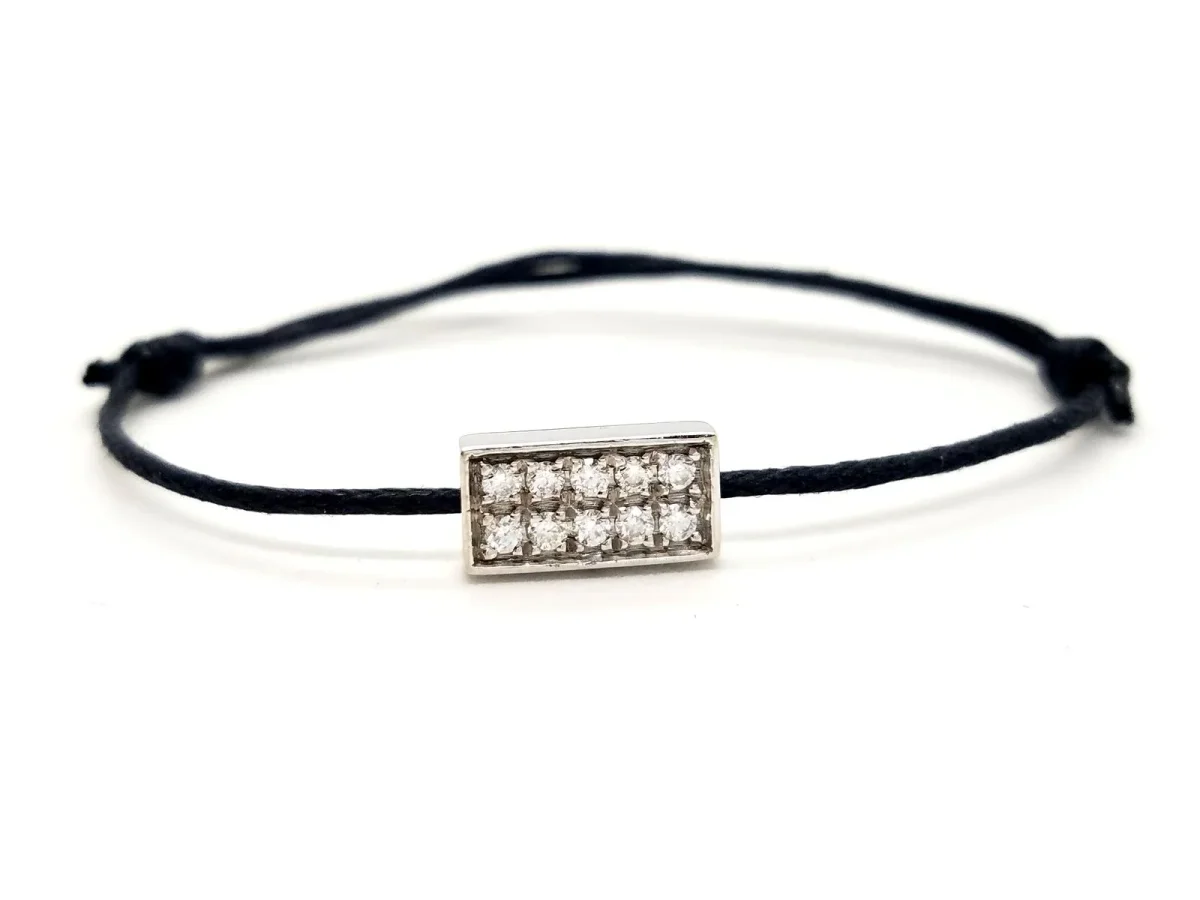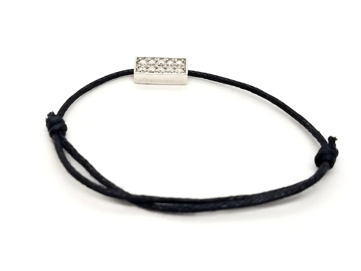 Bracelet cordon noir, composé d’un motif rectangulaire en or blanc 750 millièmes (18 carats), serti de 10 diamant taille brillant G-VS pour un total de 0,20 ct, dimension du motif: 1,15 cm x 0,6 cm, poids en or: 1,5 g, poids total: 1,43 g, taille ajustable, état neuf
