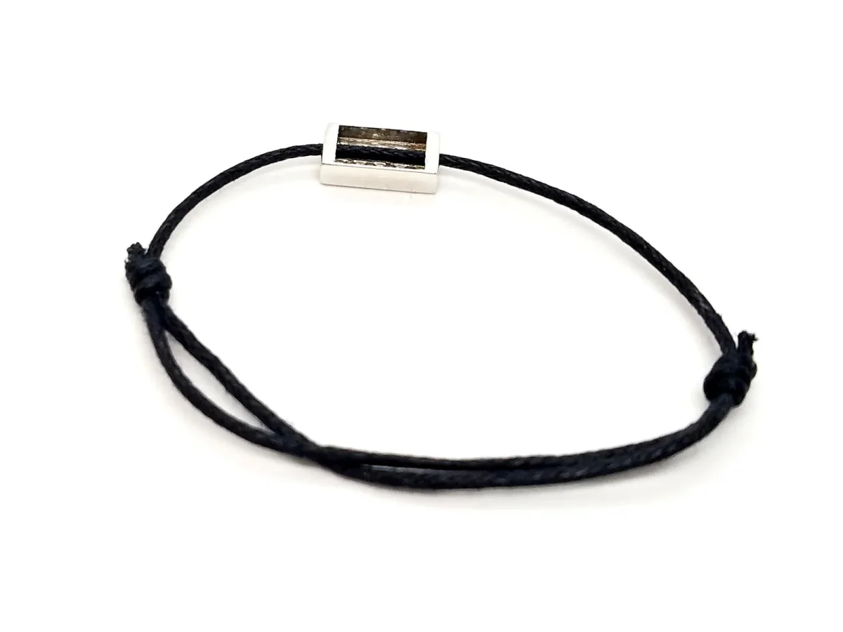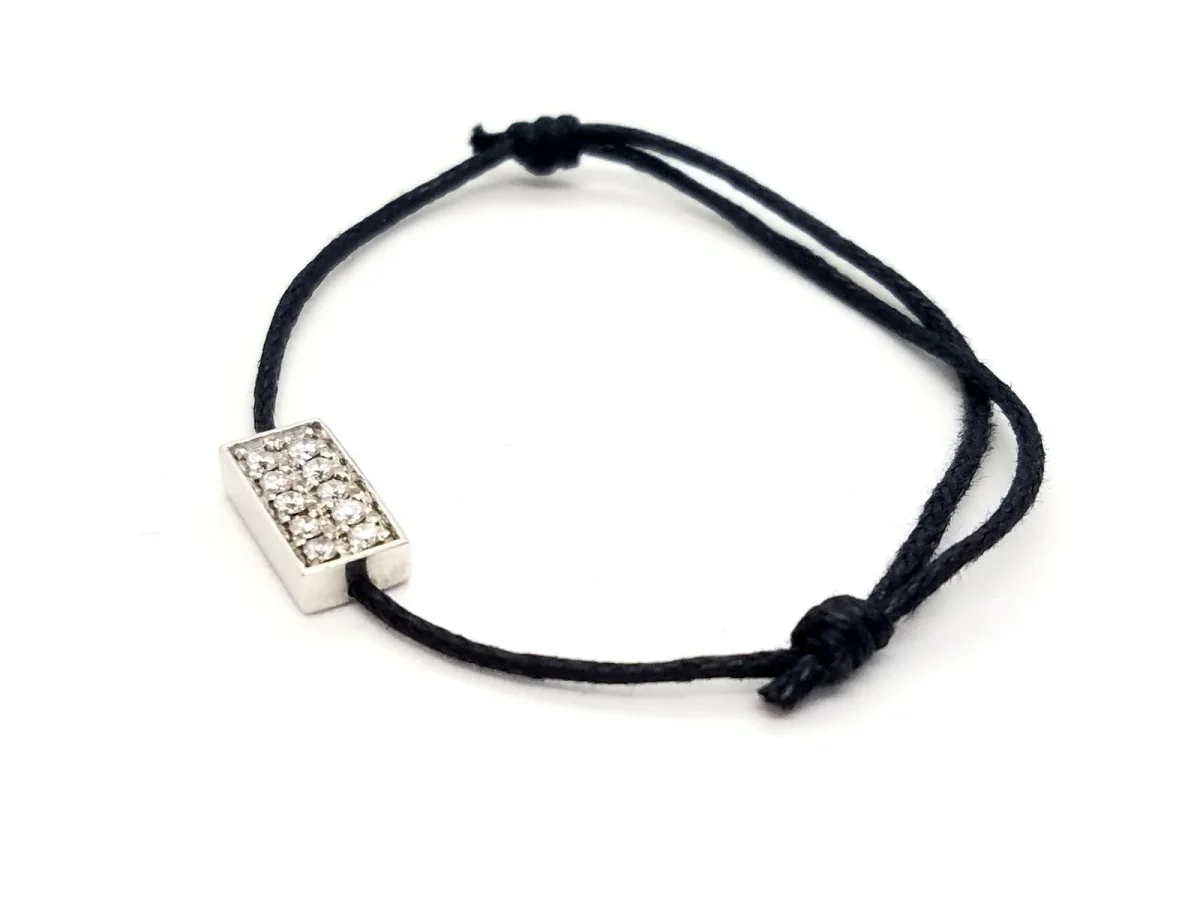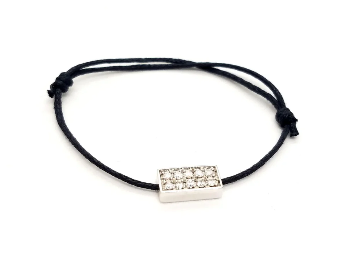 Bracelet cordon noir, composé d’un motif rectangulaire en or blanc 750 millièmes (18 carats), serti de 10 diamant taille brillant G-VS pour un total de 0,20 ct, dimension du motif: 1,15 cm x 0,6 cm, poids en or: 1,5 g, poids total: 1,43 g, taille ajustable, état neuf