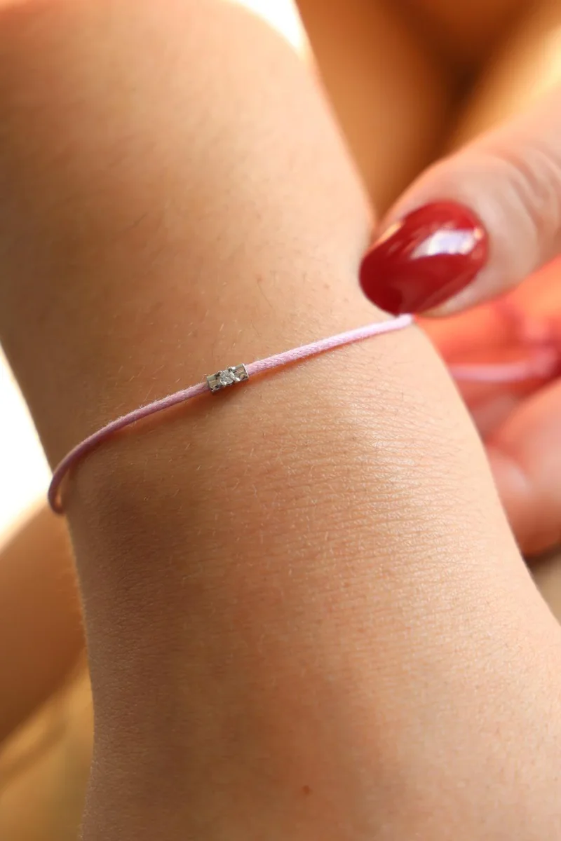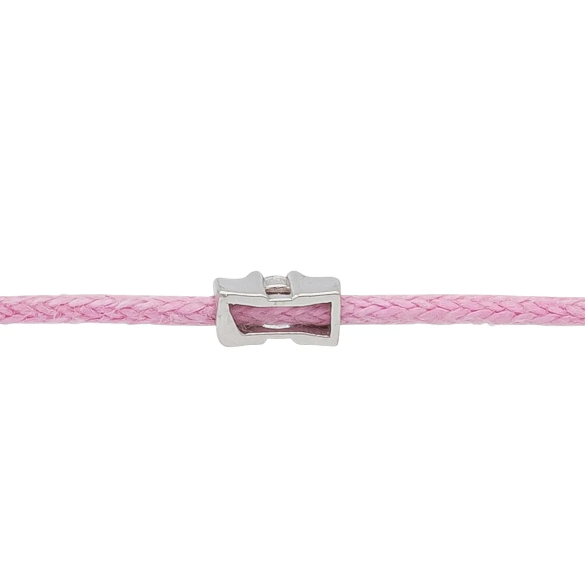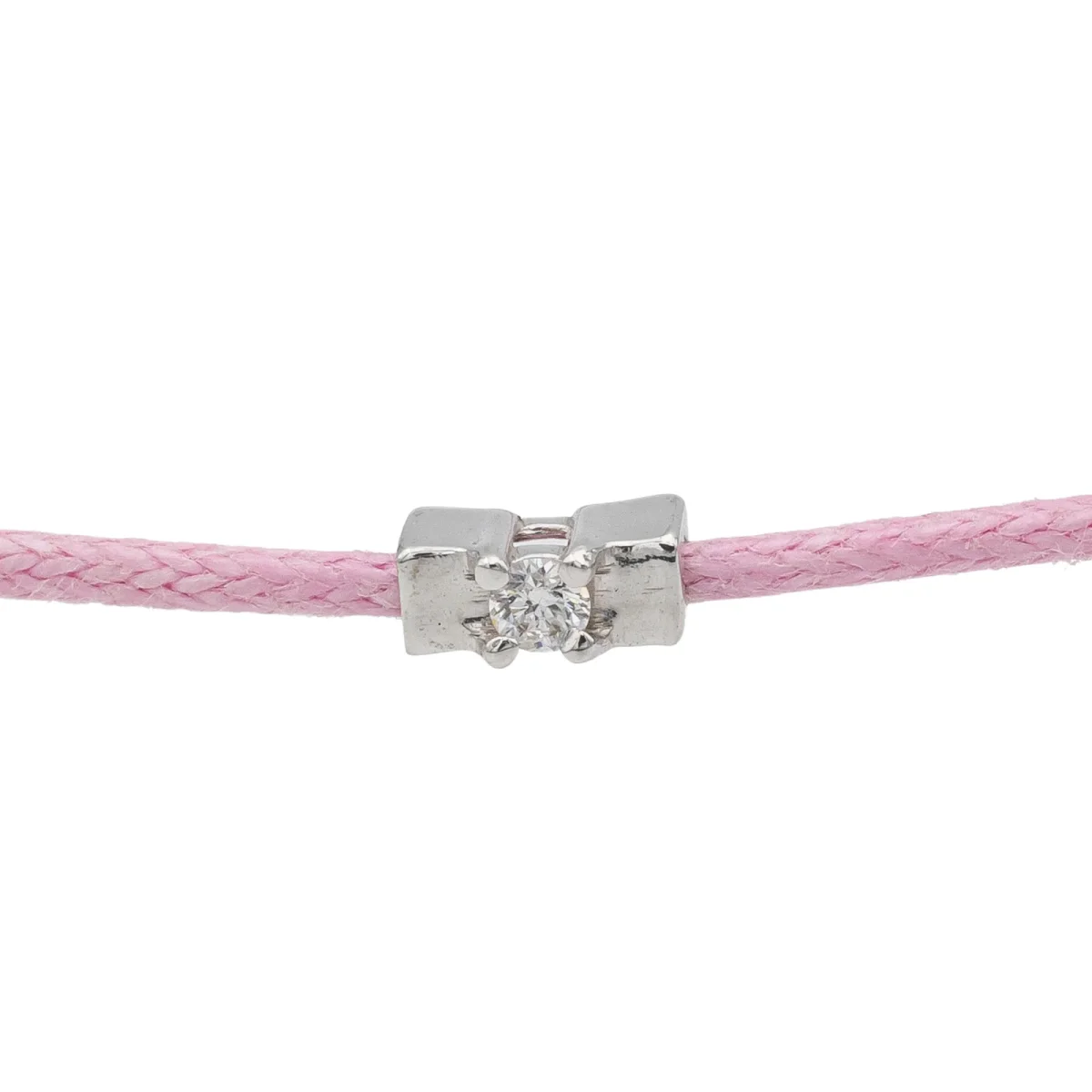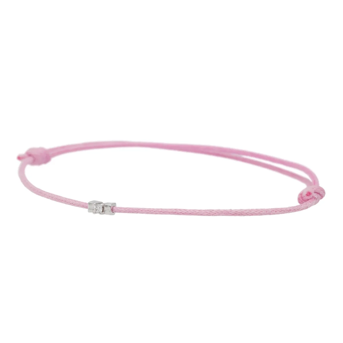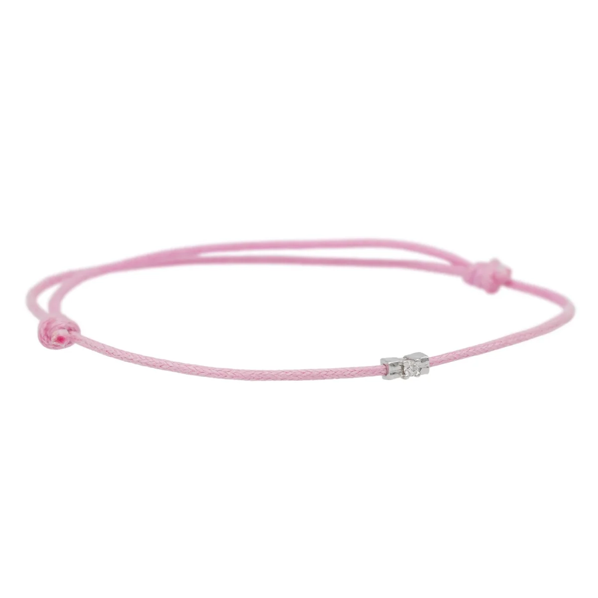 Bracelet cordon rose, composé d’un motif en or blanc 750 millièmes (18 carats) serti d’un diamant taille brillant G-VS de 0,02 ct, dimension du motif: 0,48 cm x 0,22 cm, poids en or: 0,18 g, poids total: 0,46 g, taille ajustable, état neuf