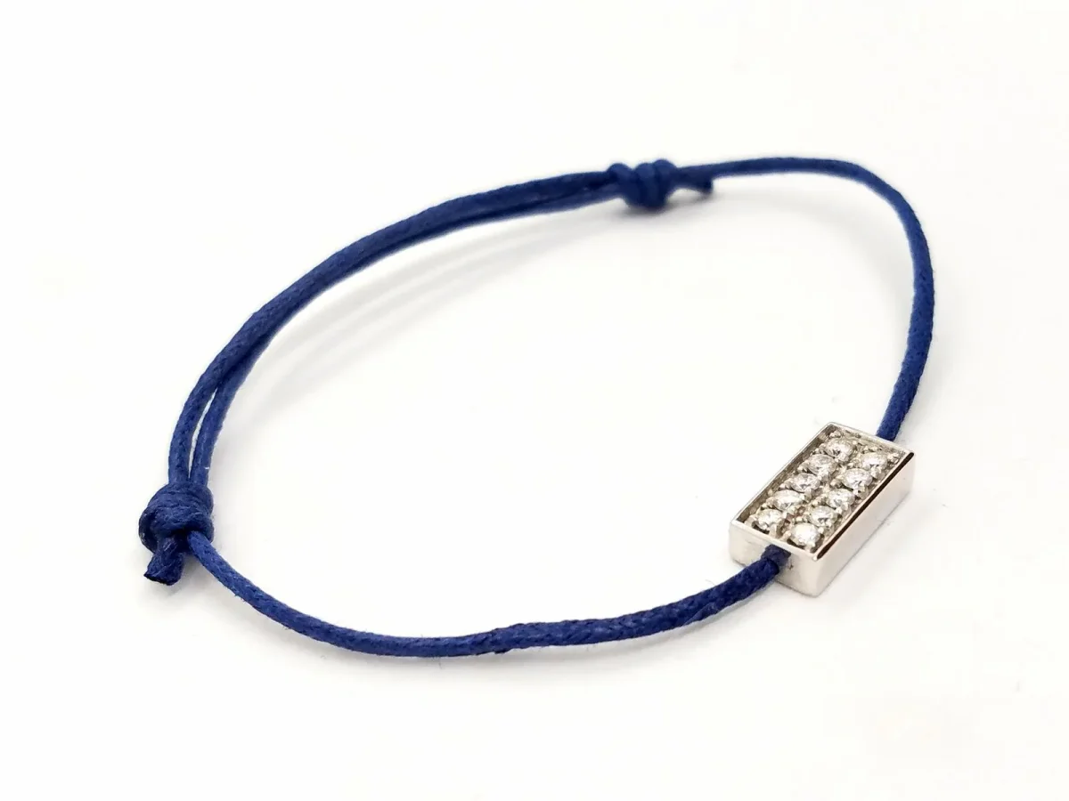 Bracelet cordon bleu foncé, composé d’un motif rectangulaire en or blanc 750 millièmes (18 carats), serti de 10 diamant taille brillant G-VS pour un total de 0,20 ct, dimension du motif: 1,15 cm x 0,6 cm, poids total: 1,50 g, taille ajustable, état neuf