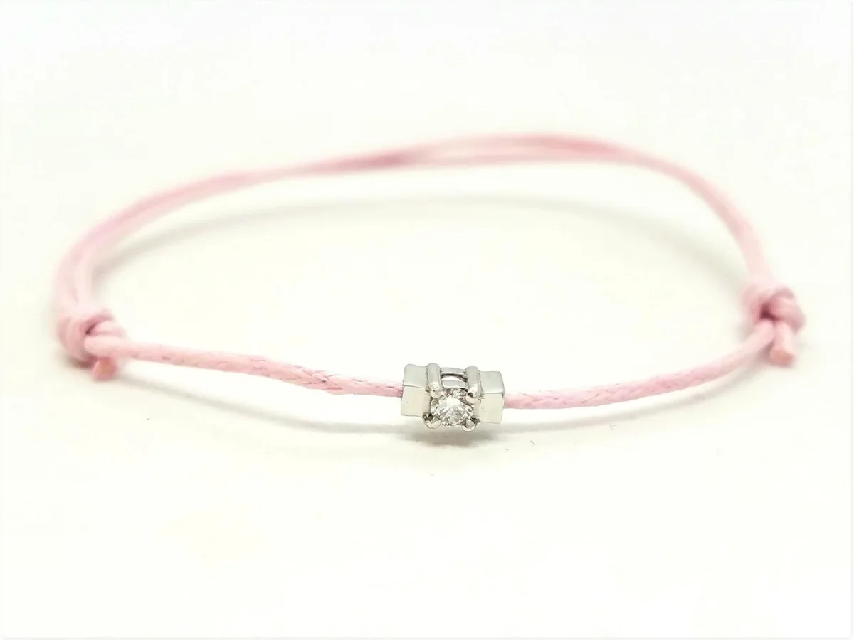 Bracelet cordon rose clair, composé d’un motif en or blanc 750 millièmes (18 carats) serti d’un diamant taille brillant G-VS de 0,06 ct, dimension du motif: 0,54 cm x 0,26 cm, poids en or: 0,24 g, poids total: 0,43 g, taille ajustable, état neuf