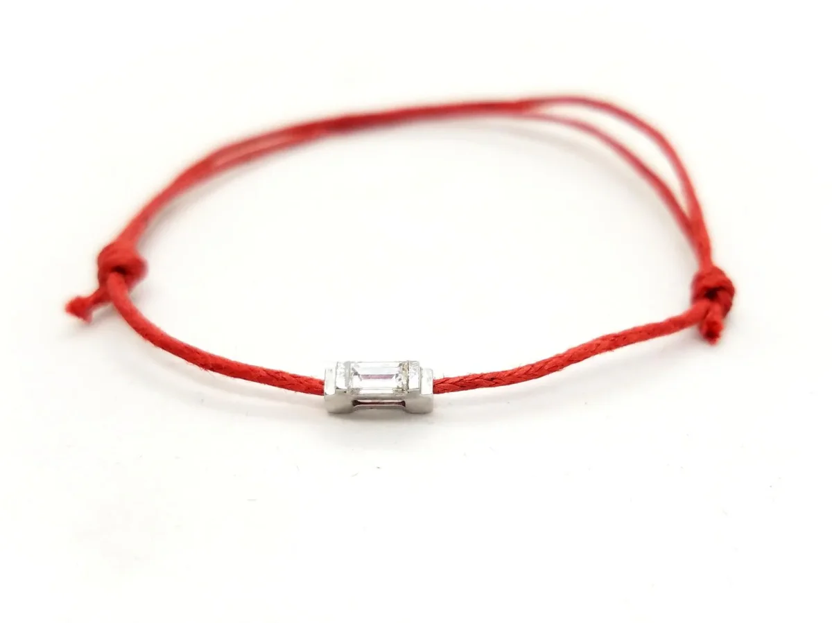 Bracelet cordon rouge, composé d’un motif en or blanc 750 millièmes (18 carats) serti d’un diamant taille baguette F-VVS2 de 0,13 ct, dimension du motif: 0,67 cm x 0,24 cm, poids en or: 0,45 g, poids total: 0,43 g, taille ajustable, état neuf