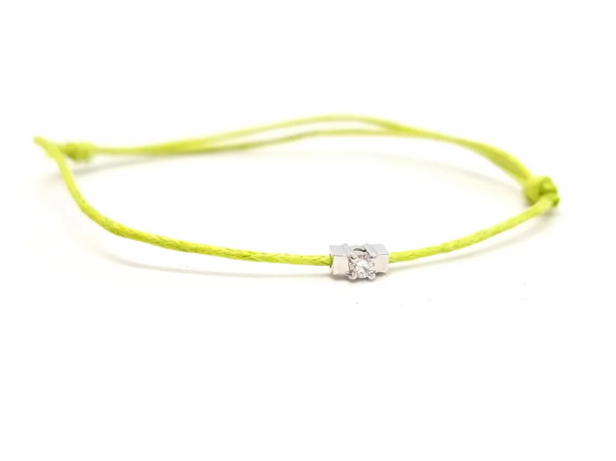 Bracelet cordon vert, composé d’un motif en or blanc 750 millièmes (18 carats) serti d’un diamant taille brillant G-VS de 0,06 ct, dimension du motif: 0,54 cm x 0,26 cm, poids en or: 0,24 g, poids total: 0,36 g, taille ajustable, état neuf