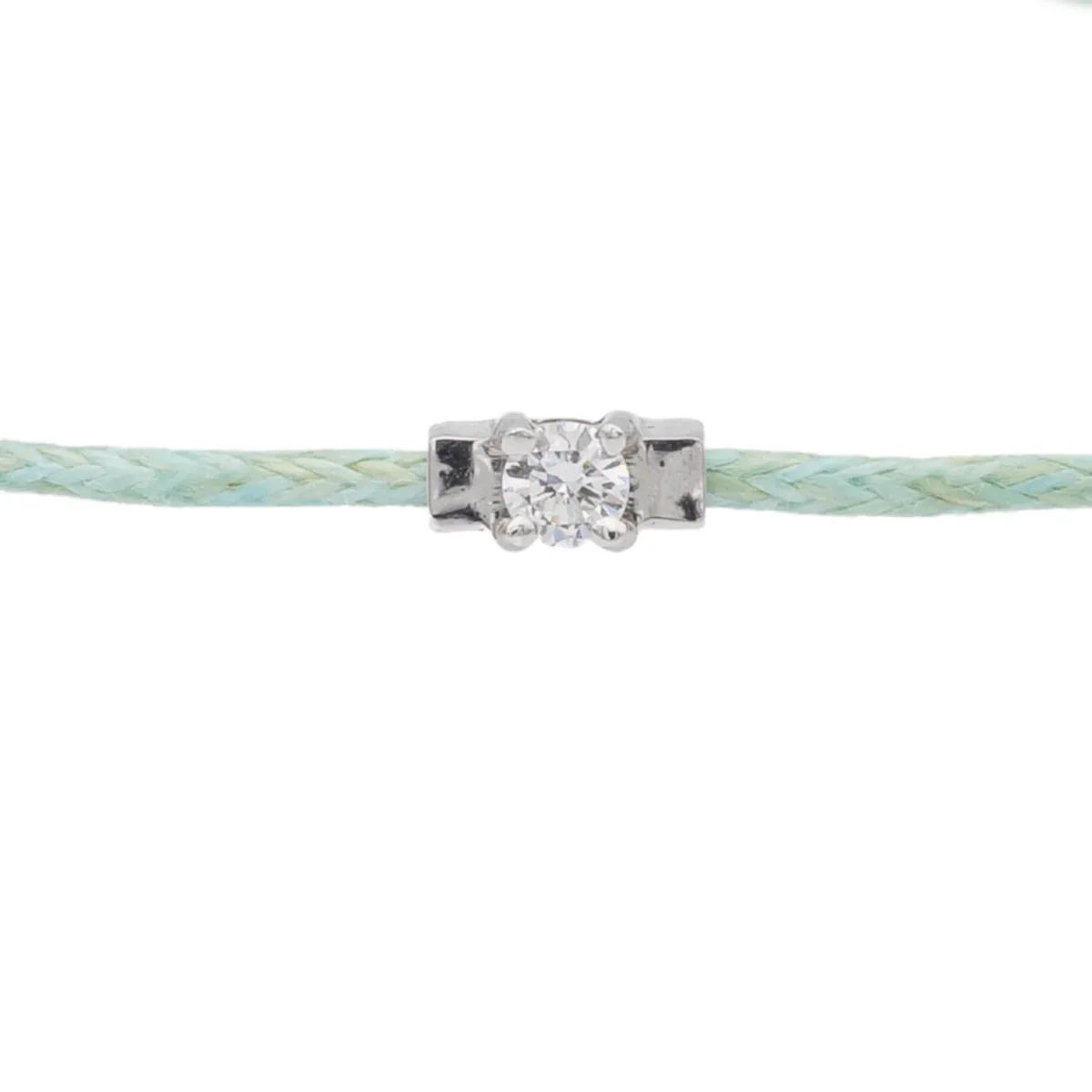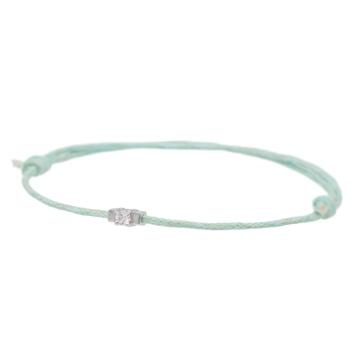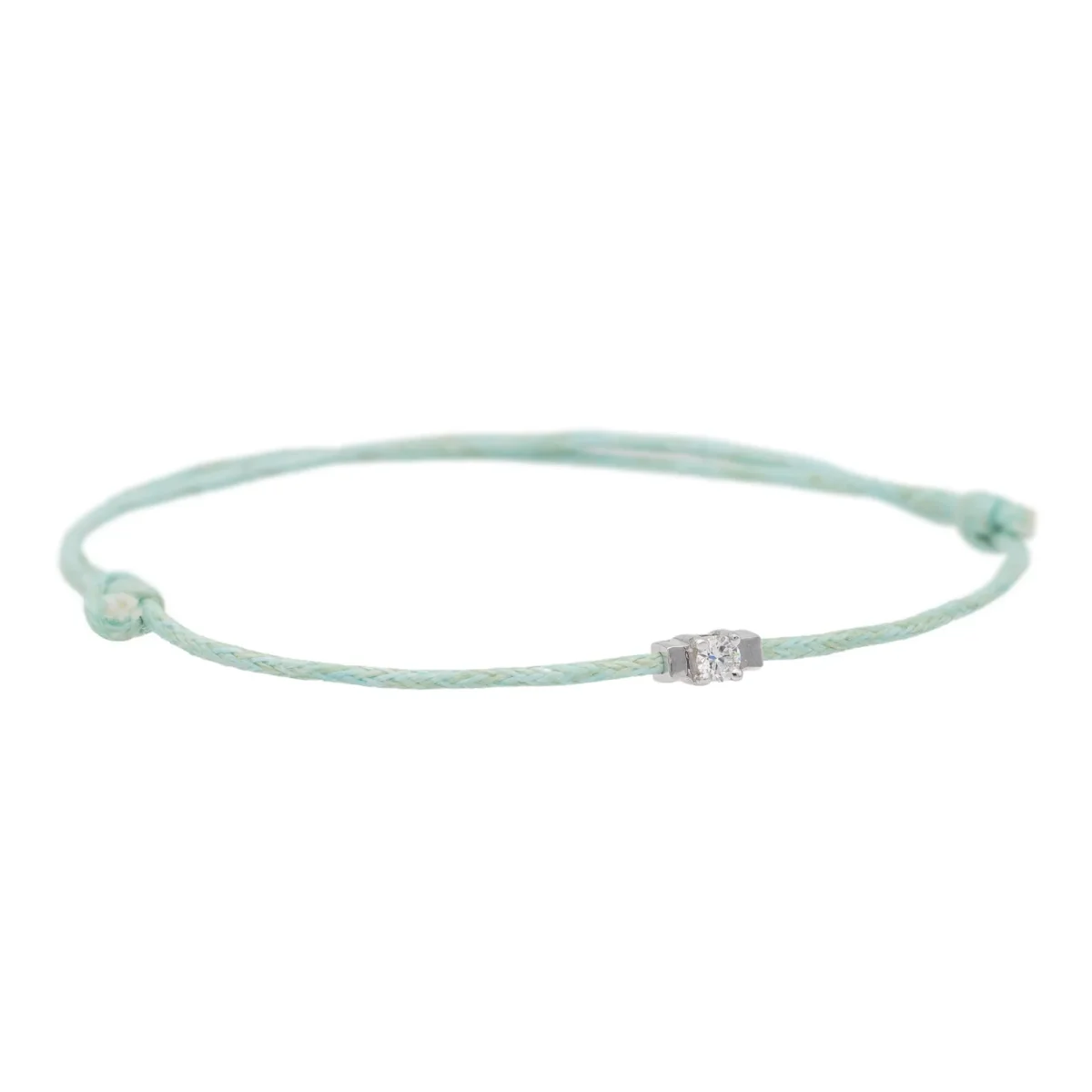 Bracelet cordon vert d’eau, composé d’un motif en or blanc 750 millièmes (18 carats) serti d’un diamant taille brillant G-VS de 0,06 ct, dimension du motif: 0,54 cm x 0,26 cm, poids en or: 0,40 g, poids total: 0,46 g, taille ajustable, état neuf